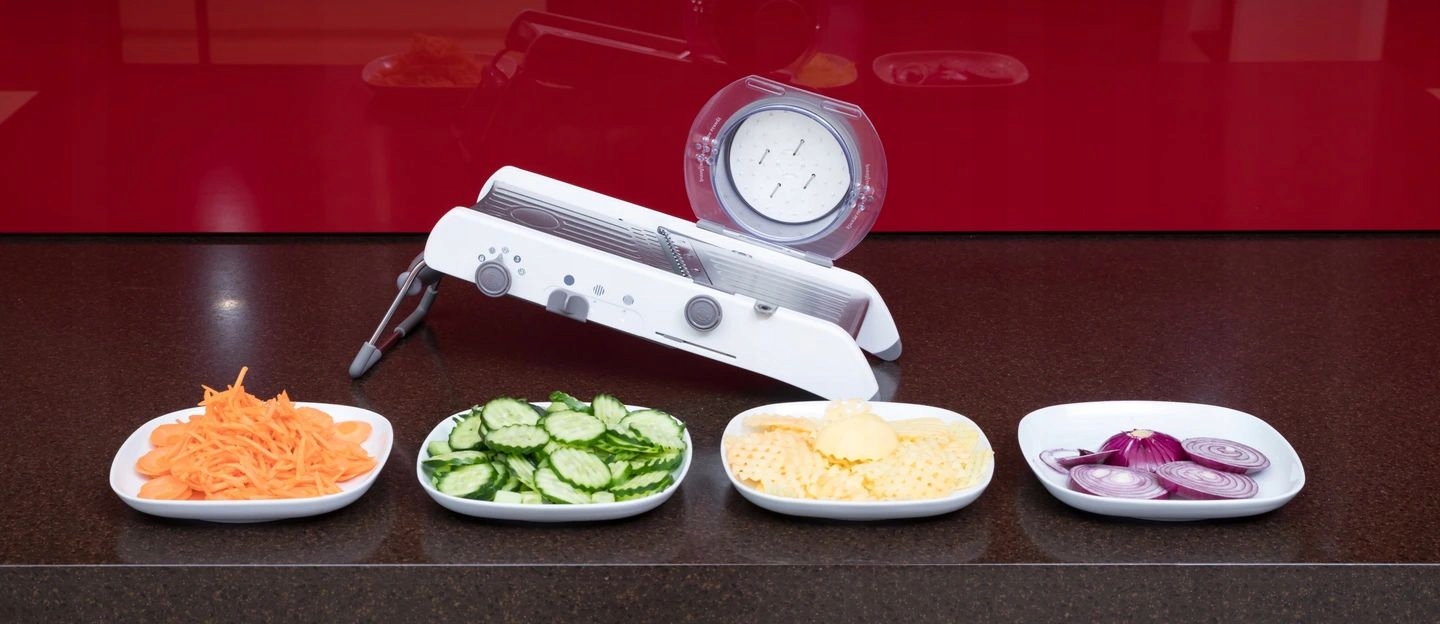 Оснащений захватом для овочів і фруктів, який дозволяє швидко нарізати. Завдяки цьому немає страху поранитися.
