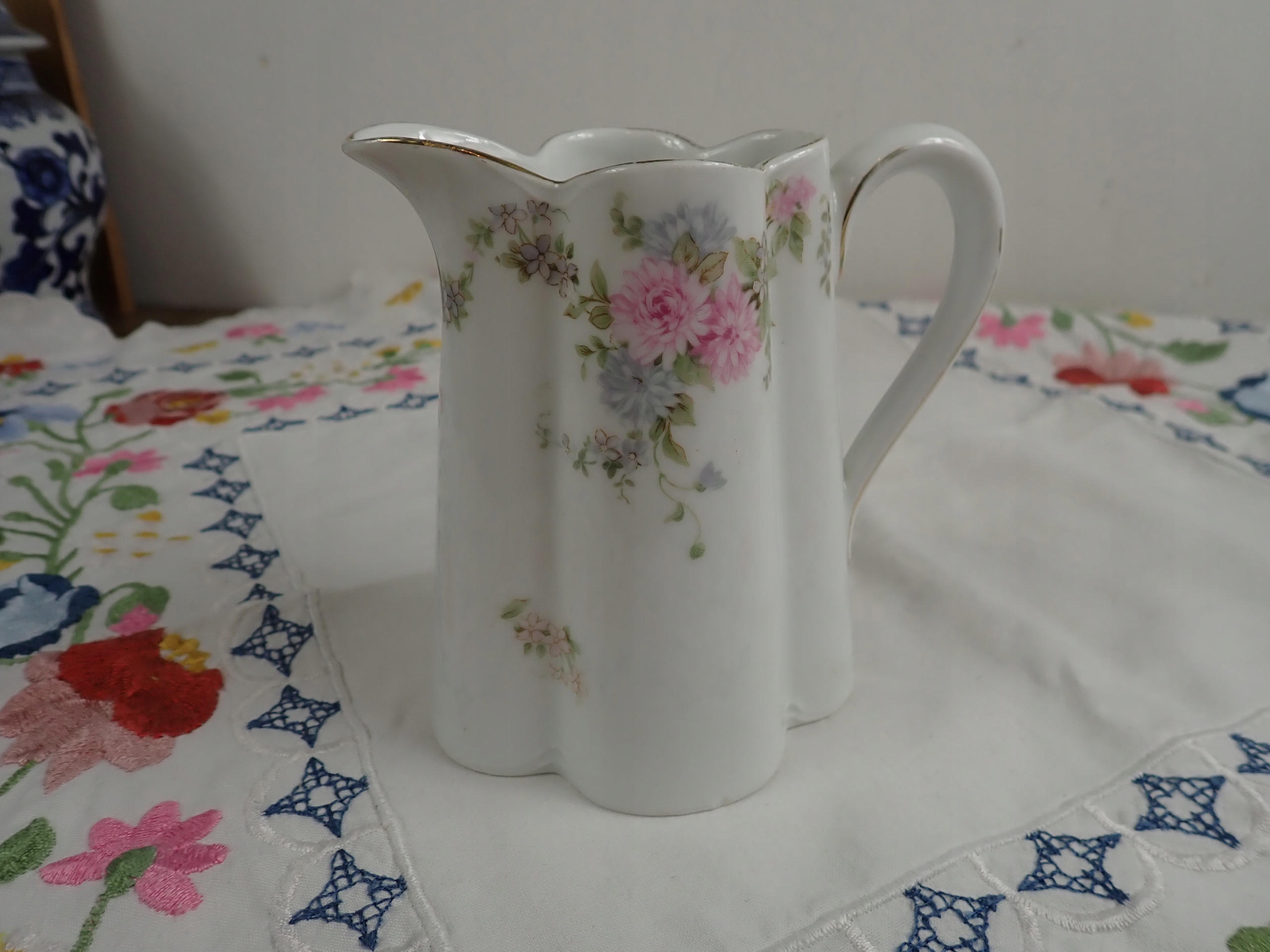 ніжна, вік, тонкий порцеляновий, позолочений та квіти, які вже втираються. Мінімальна шкода на краю основи, не дуже важлива в цілому