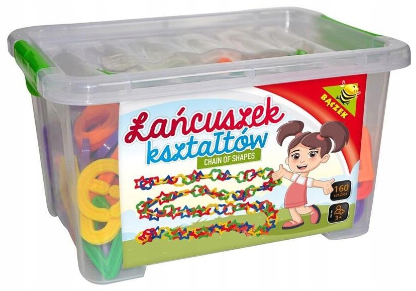 Набір барвистих форм, що містять 160 елементів. Форми, що з'єднуються разом, утворюють барвистий ланцюг будь -якої довжини. З ланцюга дитина може влаштувати букви, фігури або також може використовуватися як підвіска, наприклад для іграшок чи інших дітей. Різноманітність кольорів та форм спонукає дитину грати. Весь упакований у пластиковій закритому коробці з ручкою, яка полегшить зберігання.
