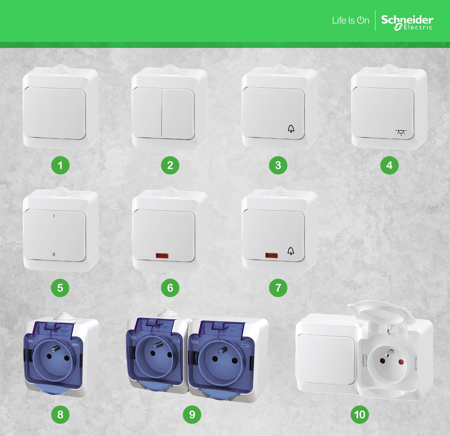 1. Однополюсний вимикач 2. Свічковий вимикач 3. Кнопка "дзвіночок" 4. Кнопка "світло" 5. Двополюсний вимикач 6. Вимикач з підсвічуванням 7. Кнопка з підсвічуванням 8. Одинарна розетка 16А 9. Подвійна розетка 16А 10 Комплект вимикач + розетка 16А