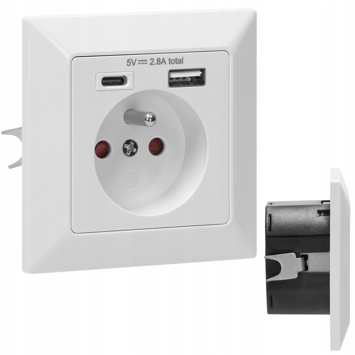 Одинна електрична розетка 2P+Z з додатковими портами зарядного пристрою USB (A + C). Після підключення відповідного USB-кабелю (не входить до комплекту) ви можете заряджати більшість доступних на ринку телефонів, планшетів і мобільних пристроїв, включаючи iPhone, iPad, iPod тощо. Гніздо виготовлено з естетичного матеріалу та має біле глянцеве покриття . Встановлення в стандартну коробку діаметром 60 мм.