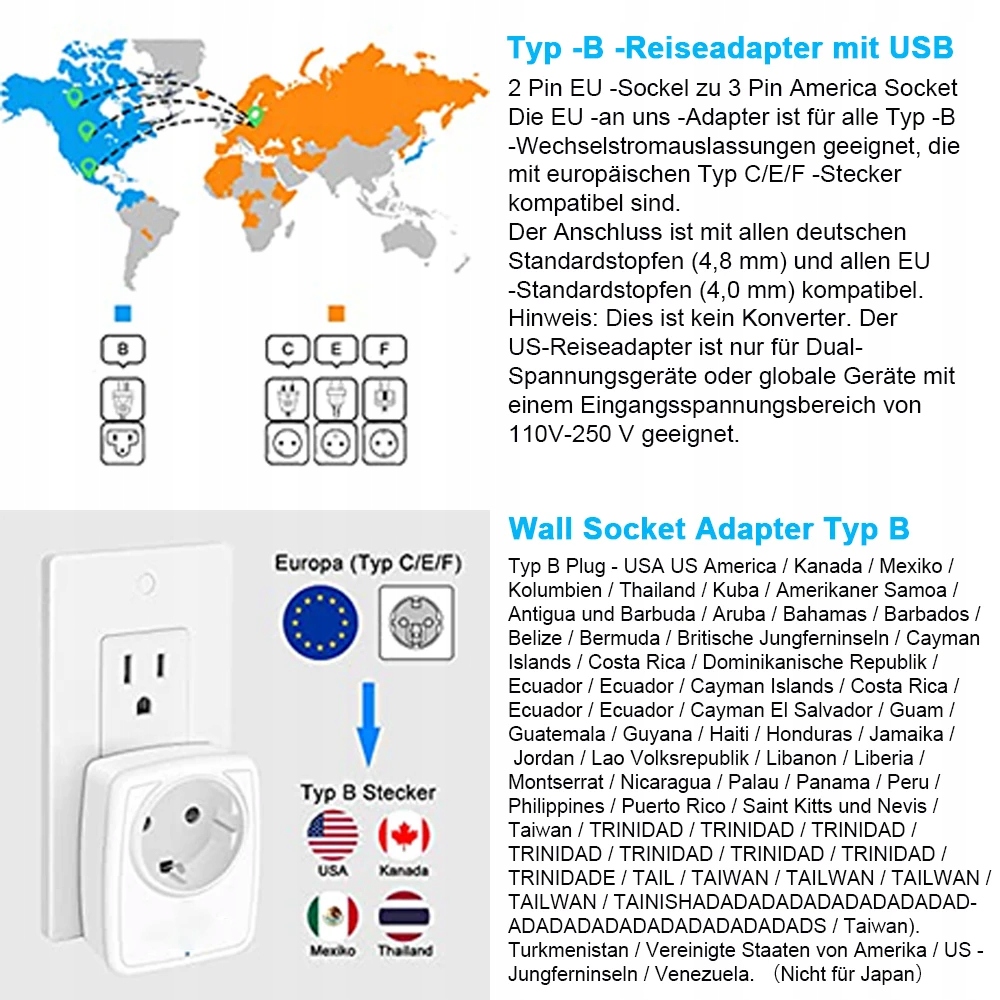【Адаптер штекера типу B】Адаптер штекера США з 2-контактної європейської вилки на 3-контактний штекер США, Канада, Мексика, Колумбія, Таїланд, Американське Самоа, Антигуа, Барбуда, Аруба, Багами, Барбадос, Беліз, Бермудські острови, Кайманові острови, Коста-Ріка, Куба, Домініканська Республіка, Еквадор, Сальвадор, Гуам, Атемала, Гітара. Яна, Гаїті, Дуррес Ямайка, Йорданія, Лаос, Ліван, Нікарагуа, Нігер, Палау, Панама, Перу, Філіппіни, Тайвань тощо.