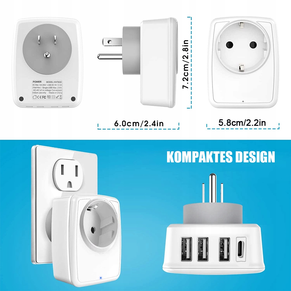 - Дорожній адаптер США для всіх зарядних пристроїв USB-A та USB-C і малих європейських пристроїв, таких як iPhone, Samsung, iPad, Airpods, планшети, камери, ноутбуки, фени для волосся, дорожні праски, бритви та більше.