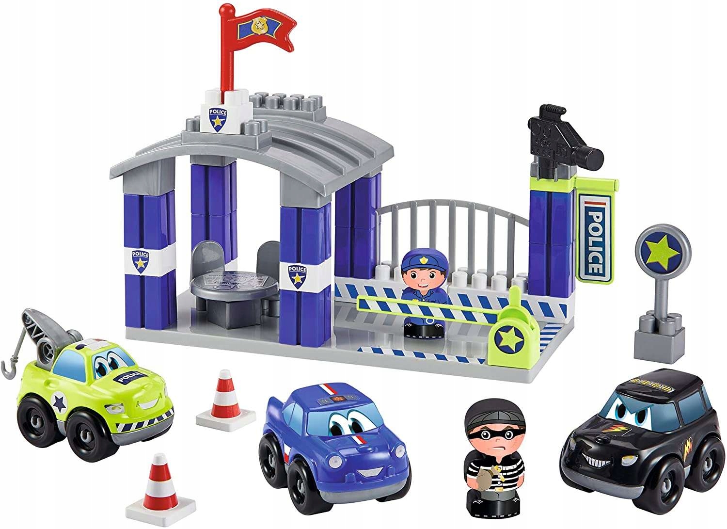 Набір складається з 58 елементів і зображує поліцейську станцію з 2 фігурками. Блоки надзвичайно барвисті та великі, тому вони ідеально підходять як для маленьких, так і для великих будівельників. У набір також входять наклейки, які дозволять вам прикрасити та персоналізувати ваші транспортні засоби та поліцейську станцію.