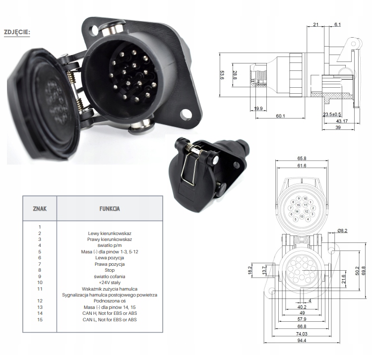 Професійна універсальна 15-контактна розетка ADR дозволяє підключати та живити електроустановку в усіх типах причепів, напівпричепів та евакуаторів. 15-контактний роз’єм підтримує повний набір освітлення причепа, а також додаткові функції, такі як датчик зносу гальмівних колодок, індикатор гідравлічного гальма та механізми підйому осі.