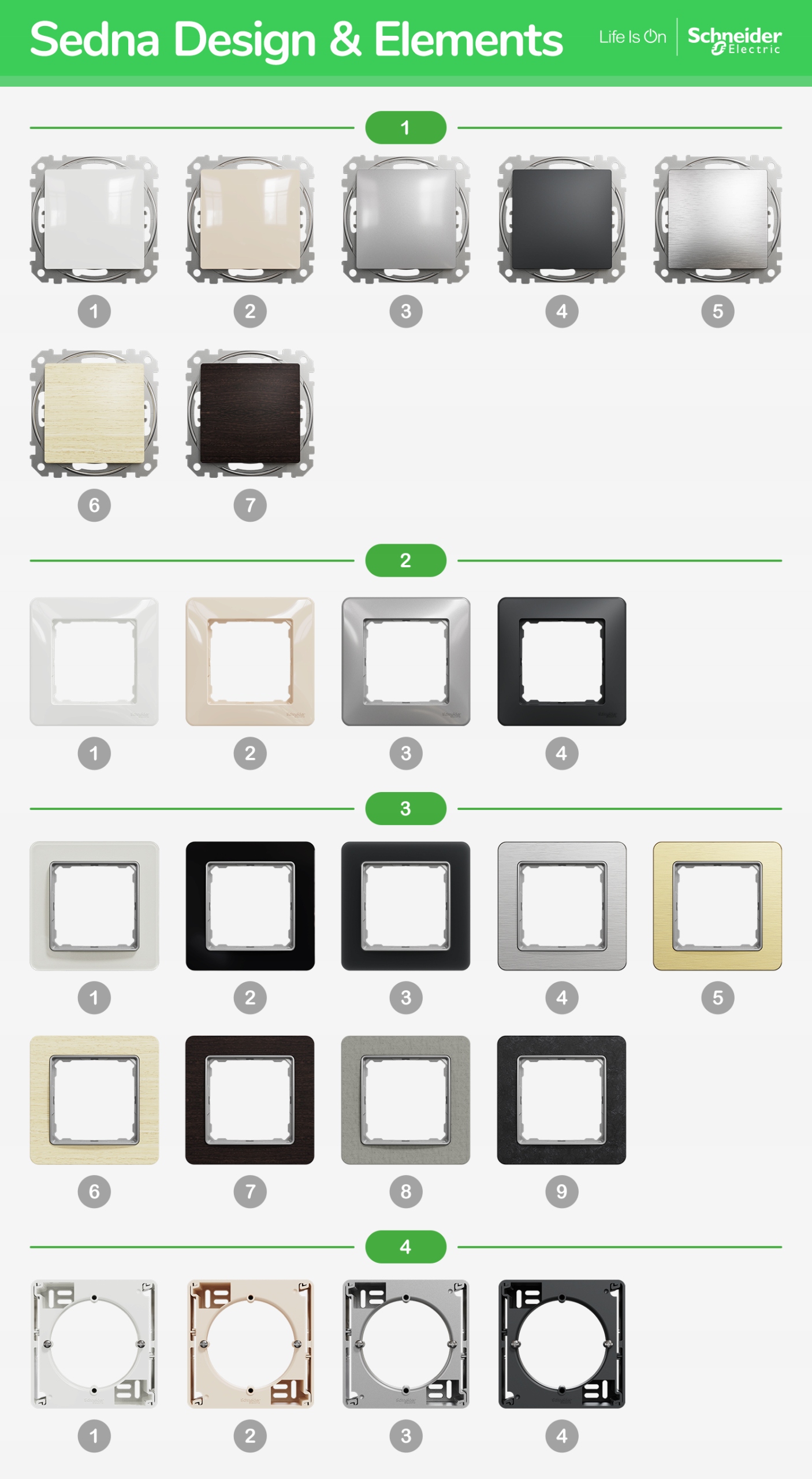Механізм Sedna Design і Sedna Elements сумісні з усіма рамами цієї серії. Це дозволяє створити аж 91 різну колірну комбінацію, завдяки чому ви зможете підібрати виріб до облаштування вашого інтер'єру. Продукція серії Sedna Elements виготовлена з матеріалів, які ідеально імітують природні матеріали, такі як скло, дерево чи камінь.