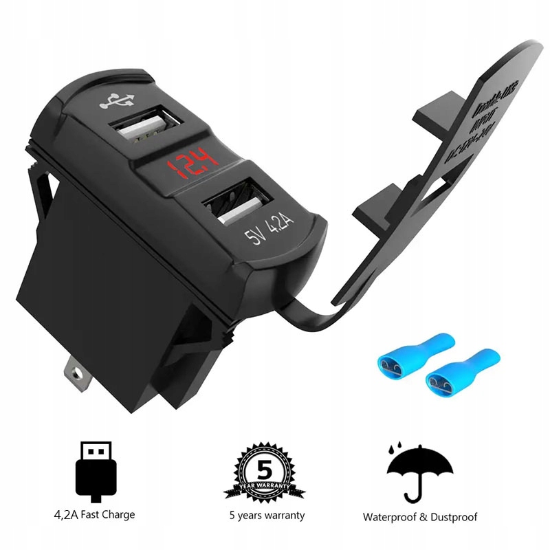 Яхтний вольтметр із розетками USB A, що дозволяє встановлювати біля вимикачів, напр. в яхтовому комутаторі. Швидка зарядка QC 3.0, проста установка, червоне світлодіодне підсвічування. У набір входить запобіжник і джгут проводів довжиною 60 см.