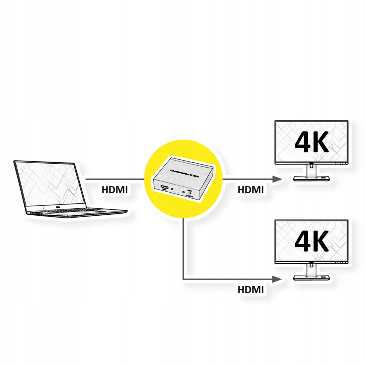 - Помножує відеосигнал HDMI на два відеосигнали HDMI із роздільною здатністю 4K