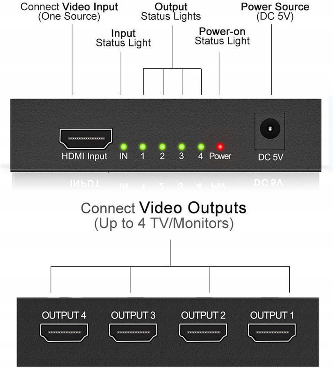 ➡ Один вхід HDMI і чотири виходи з ідентичним зображенням і звуком на всіх екранах.
