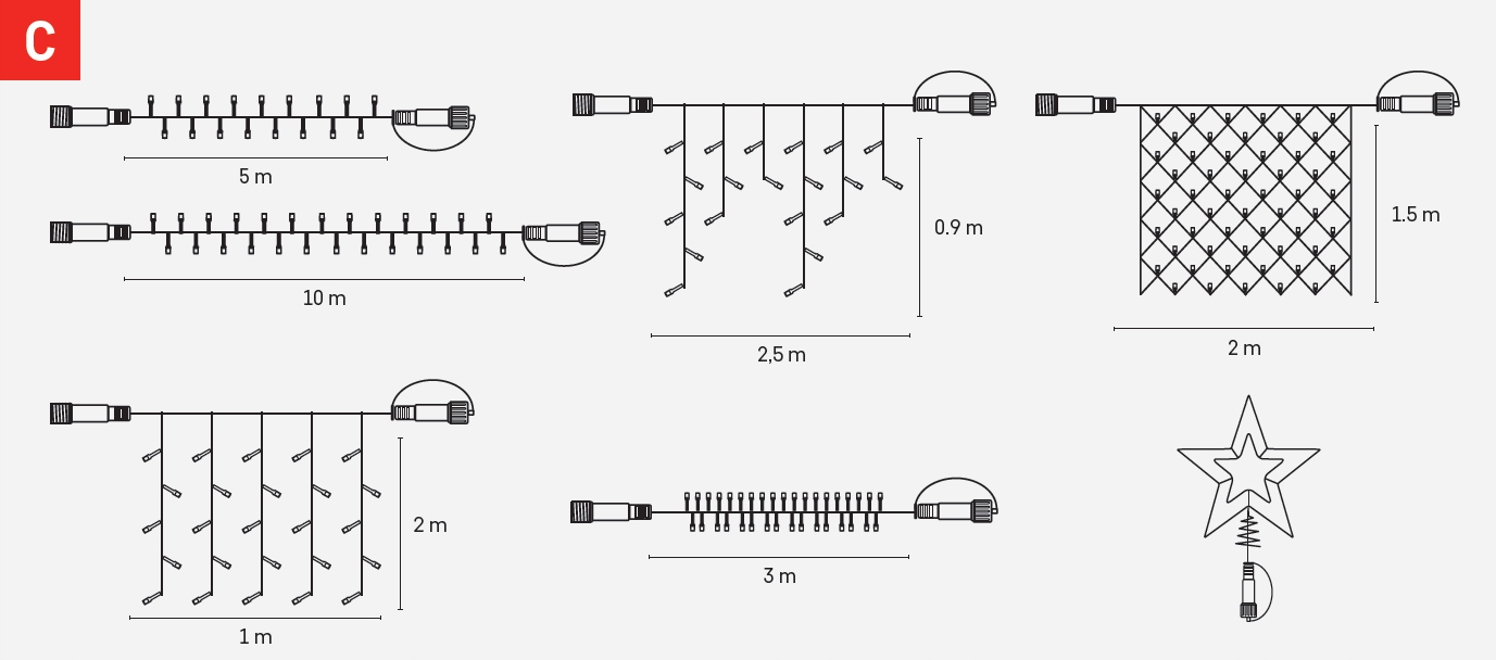 - розгалужувач* (B) – це додатковий аксесуар, який розділяє освітлення на два кінці з можливістю підключення. Завдяки цьому освітлення можна розподілити в кількох напрямках, створюючи справді тривимірну новорічну прикрасу