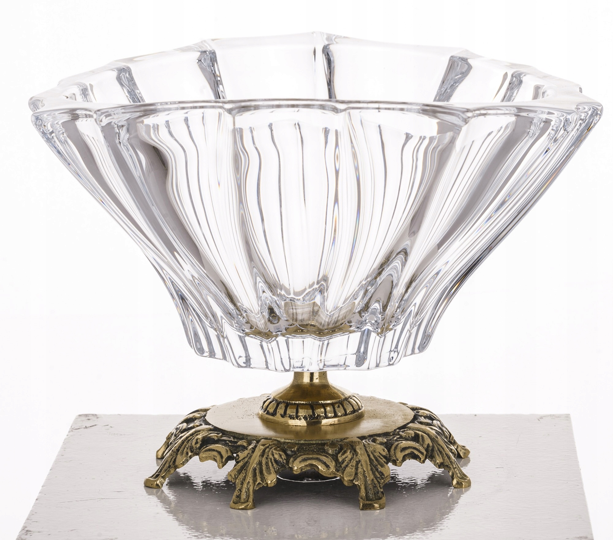 Розкішна патера, виготовлена з кришталевого скла Богемії на латунній основі - 14x22x19,5 см. Ця прозора декоративна миска була вбудована на стильну декоративну основу із золотою латунь, що робить її не лише практичним елементом обладнання, але й ексклюзивним оздобленням будь -якого столу чи скринь. Елегантне золото