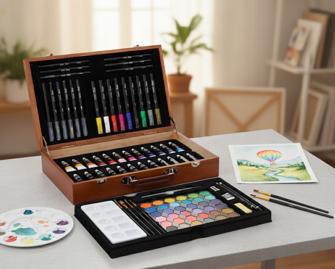 Відкрийте свій талант із комплексним набором мистецтв у стильній дерев’яній коробці! З 92 елементами, включаючи акрилові фарби, акварельні фарби, фломастери, пензлі та олівці, у вас є все під рукою для малювання, живопису та дизайну. Ідеальний набір як для початківців, так і для досвідчених художників. Завдяки зручному футляру ви можете легко взяти матеріали з собою, куди завгодно. Набір ідеально підходить для дому, школи та подорожей!