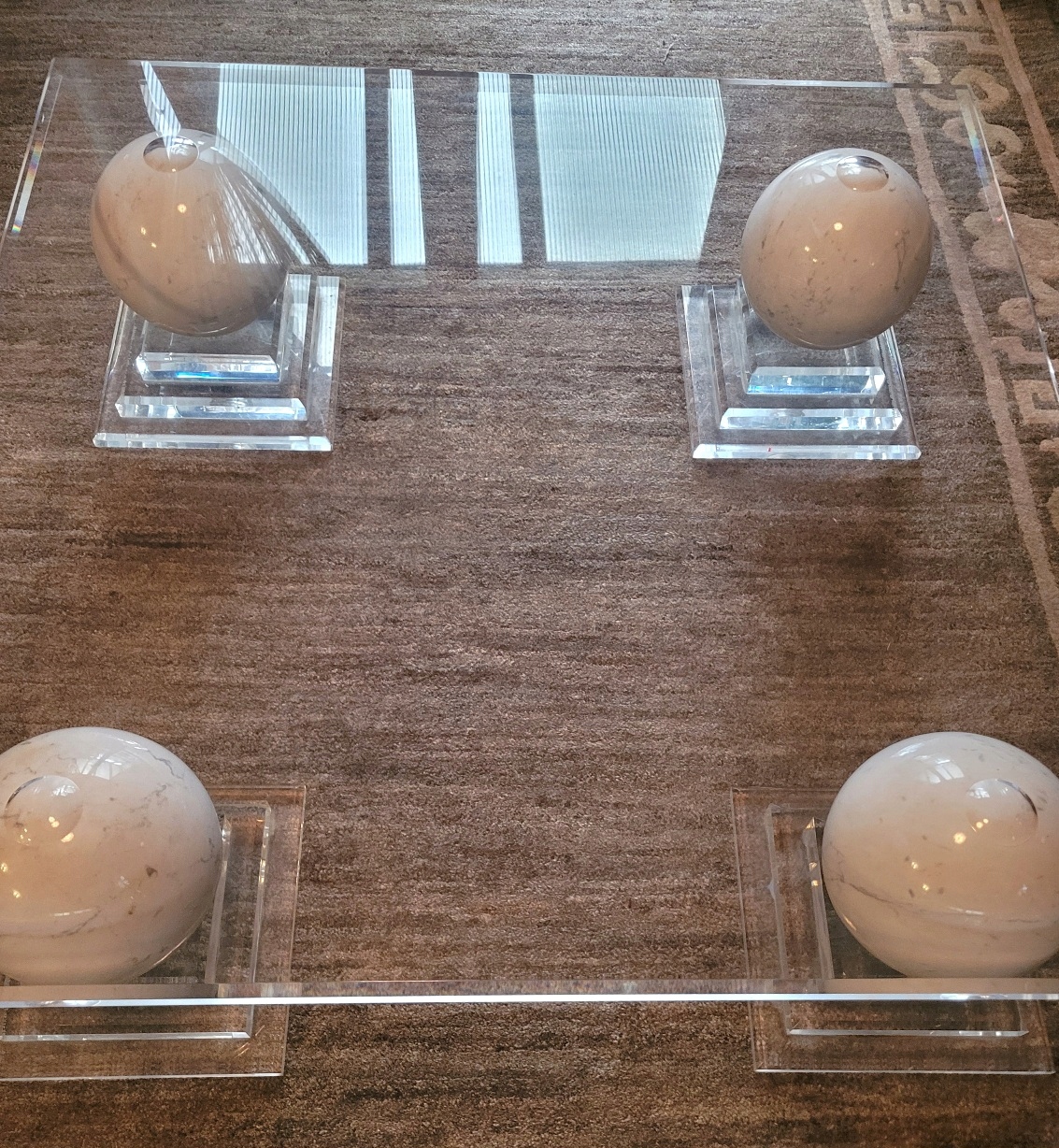 Дуже красивий і елегантний журнальний столик для вітальні з міцного дуже товстого акрилового скла з кульками зі справжнього мармуру
