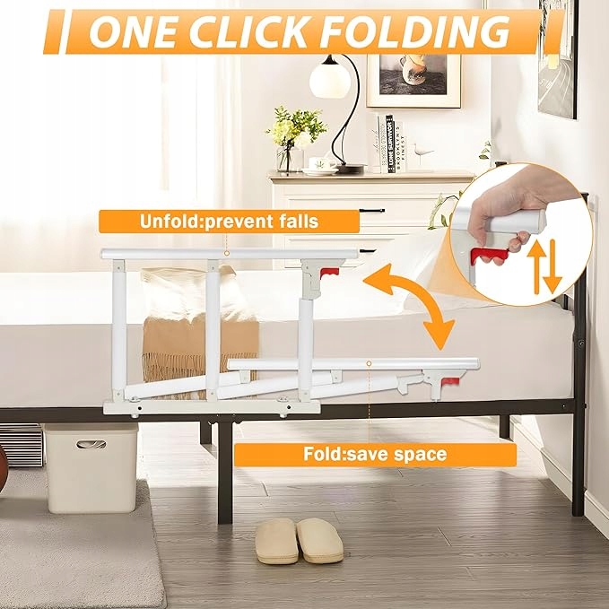 🛏️ Компактна складна поручня для ліжка: швидко складається натисканням червоної кнопки, прибирається вбік, коли не використовується. Протиковзкі пластикові кришки забезпечують тиху роботу.