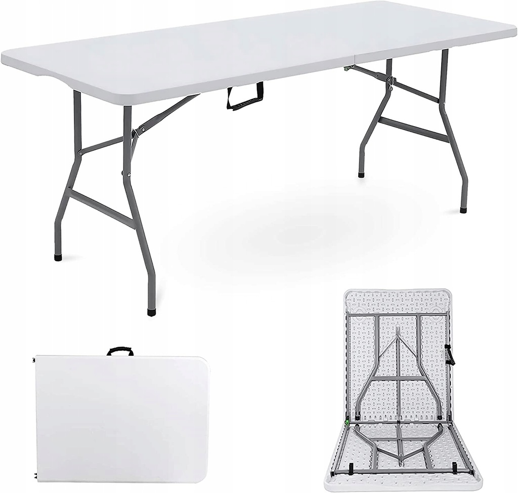 Розкладний стіл для кемпінгу/кейтерингу. Дуже практичний і легкий. Конструкція виготовлена зі сталі з порошковим покриттям. Стільниця виготовлена з міцного пластику HDPE. У складеному стані стіл утворює практичну валізу, тому він займає мало місця та легко пересувається.
