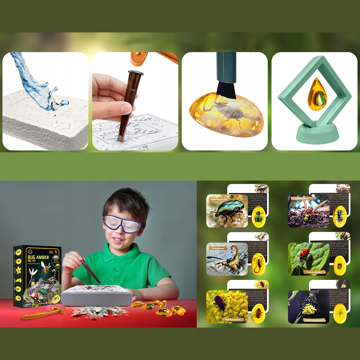 ✔️[Простий у використанні] Набір для риття комах для дітей виготовлений з нетоксичного та безпечного гіпсу. Додані окуляри та інструменти для копання дозволяють викопувати бурштинові зразки комах. Рамка дисплея, повнокольоровий навчальний посібник та ідентифікаційна картка допоможуть сортувати та ідентифікувати окремі скам’янілості бурштину, які можна зібрати в невеликий сітчастий мішечок.