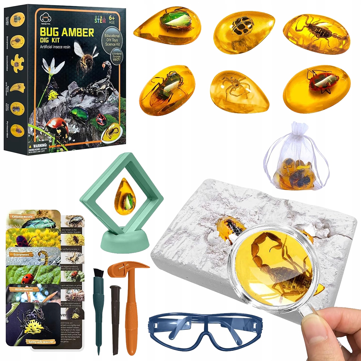Набір для копання комах включає надгробок із 6 різними зразками бурштинових комах, 1 долото, 1 невеликий молоток, 1 пензлик, 1 пара окулярів, 1 збільшувальне скло, 1 маленьку сітку, 1 рамку для дисплея та 6 навчальних карток про комах.