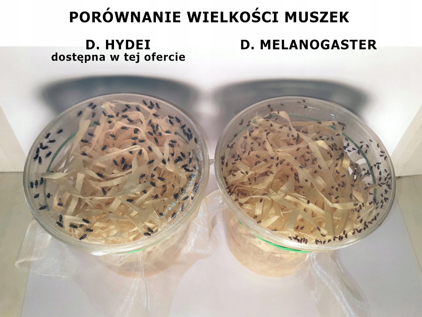 Drosophila hydei — плодова мушка більша, довжина тіла 3-5 мм, об’ємна маса в 3-5 разів більша за меншу різноманітність мух і диких літаючих мух, т.зв. закваски. Розвиток від яйця до імаго триває 14-30 днів (тривалість залежить від температури).