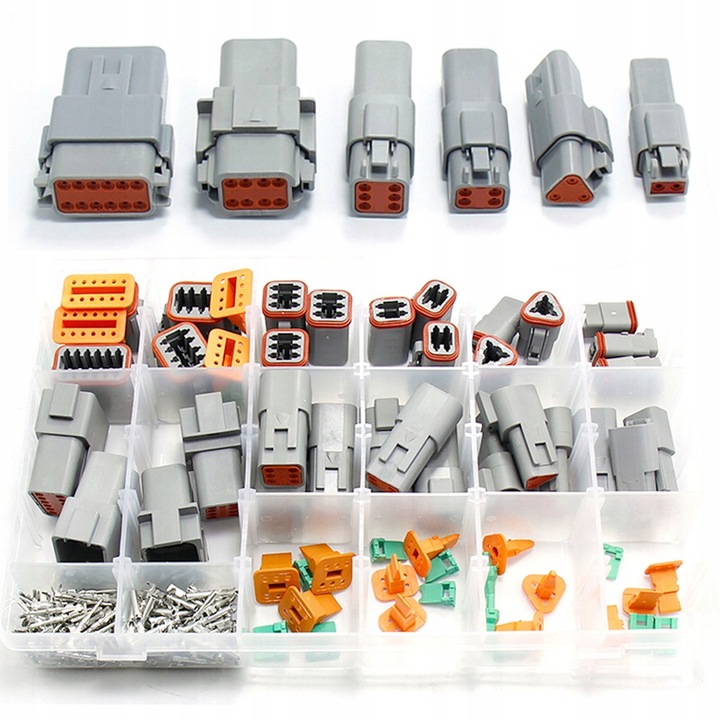 Повний набір автомобільних роз’ємів, які ідеально підходять для застосування в автомобільній промисловості, у датчиках і пристроях в автомобілях. Наші конектори забезпечують надійну ізоляцію та герметичність. Набір складається з 250 різних комбінацій з’єднувачів, які підходять для найпопулярніших діаметрів кабелів.