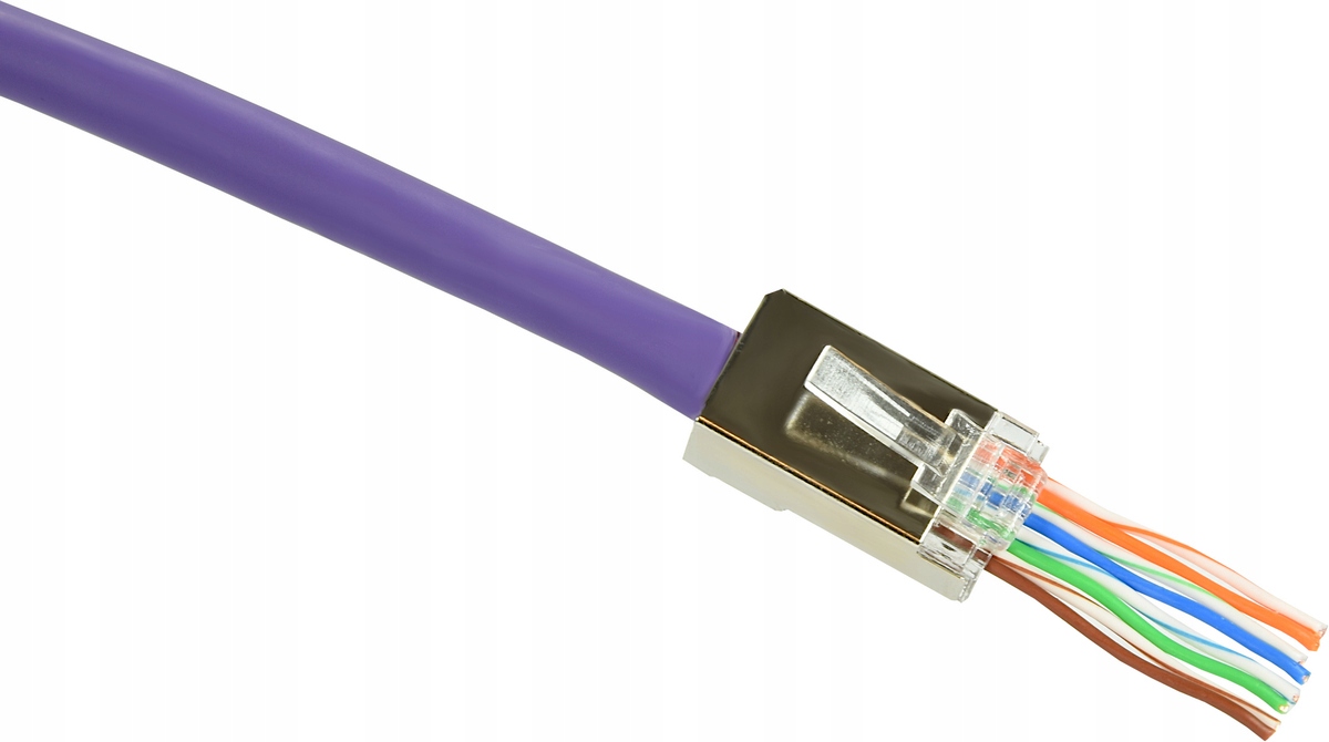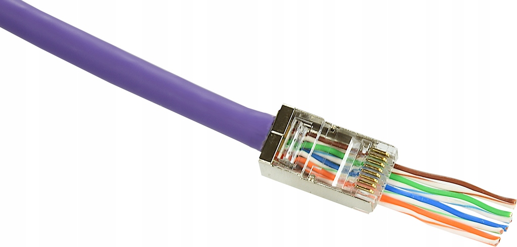 Універсальний екранований роз'єм RJ45, кат., що дозволяє повністю протягнути дроти через вилку. Завдяки наскрізному проходу дроти розташовані рівномірно, що дає установнику можливість візуально контролювати порядок проводів перед обтиском.