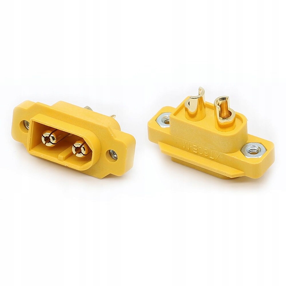 Штекерний роз'єм XT60E-M. Має отвори з гайками з боків для прикручування до панелі або кронштейна. Роз'єм має позолочені контакти і сильнострумовий: 30А (постійний струм), 60А (миттєвий). Вилки XT60 підходять до цього роз’єму. Рекомендується припаяти дроти до роз’єму, щоб забезпечити безпечне використання, спеціальний переріз 12 AWG або 14 AWG. Використовуйте гвинти M2.5 для кріплення роз’єму.
