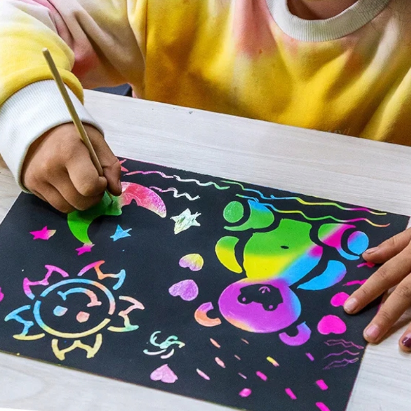 Просто використовуйте дерев’яні стилі, щоб подряпати чорну фольгу, щоб виявити красиві кольори веселки. Чорний порошок на подряпинному папері та наконечниках можна легко витерти після малювання.