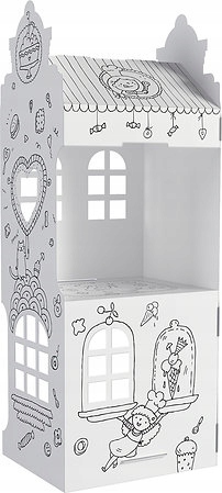 Просторий будиночок для розмальовок із міцного білого картону. Великі, точно вирізані елементи, які легко збираються без клею та ножиць. Графічні інструкції на зворотному боці упаковки. Рухомі частини, вікна, відкриті місця та полиці роблять іграшку більш привабливою.
