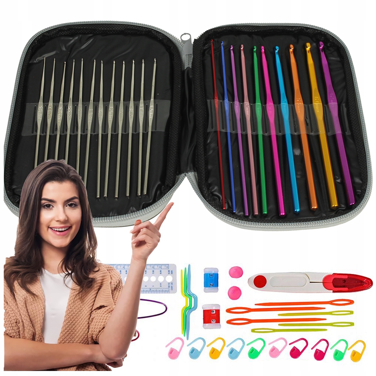 Набір, безумовно, буде корисним для всіх, хто почав або просто розпочне свою пригоду з гачком! Набір включає аж 50 елементів, таких як в'язання гачком, голки, ножиці, лінійка та багато інших необхідних аксесуарів. багато років.