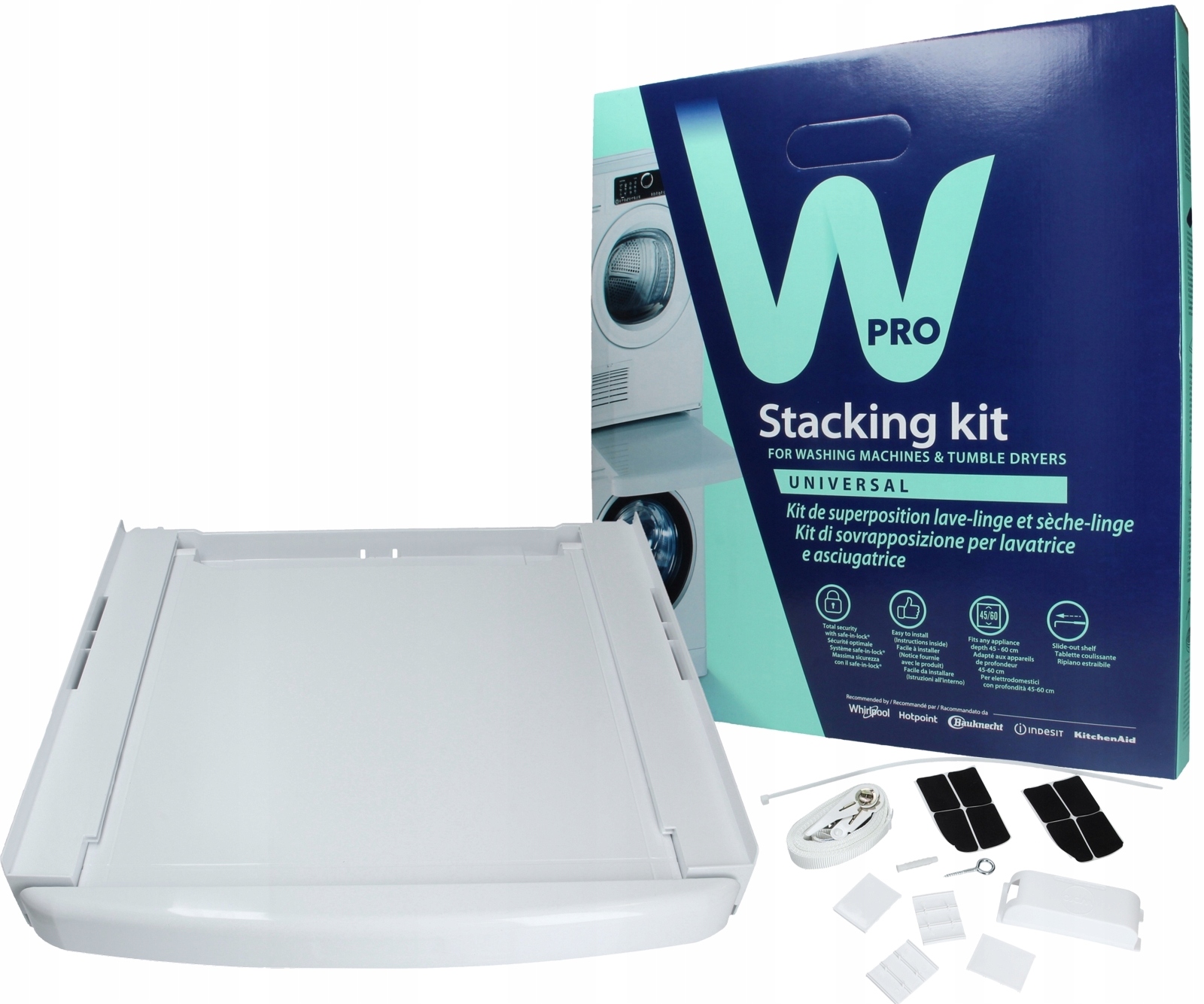 Цей набір є 100% універсальним: він підходить для всіх типів пральних та сушильних машин із фронтальним завантаженням розміром 60 х 60 см.