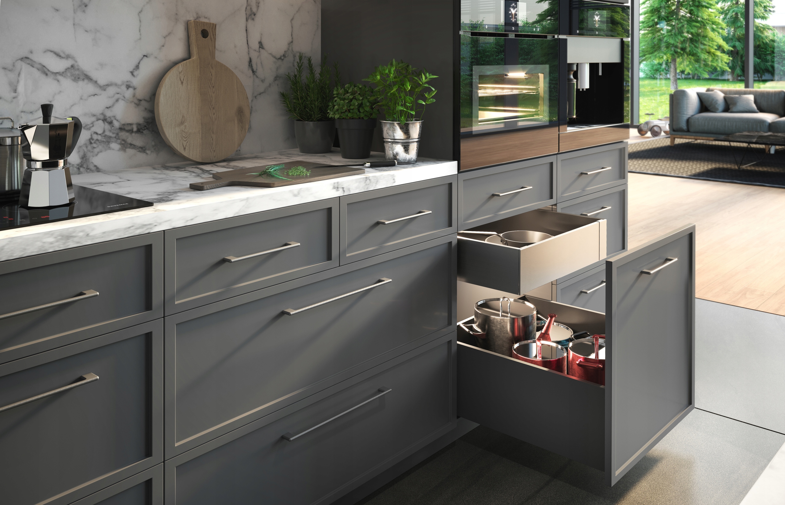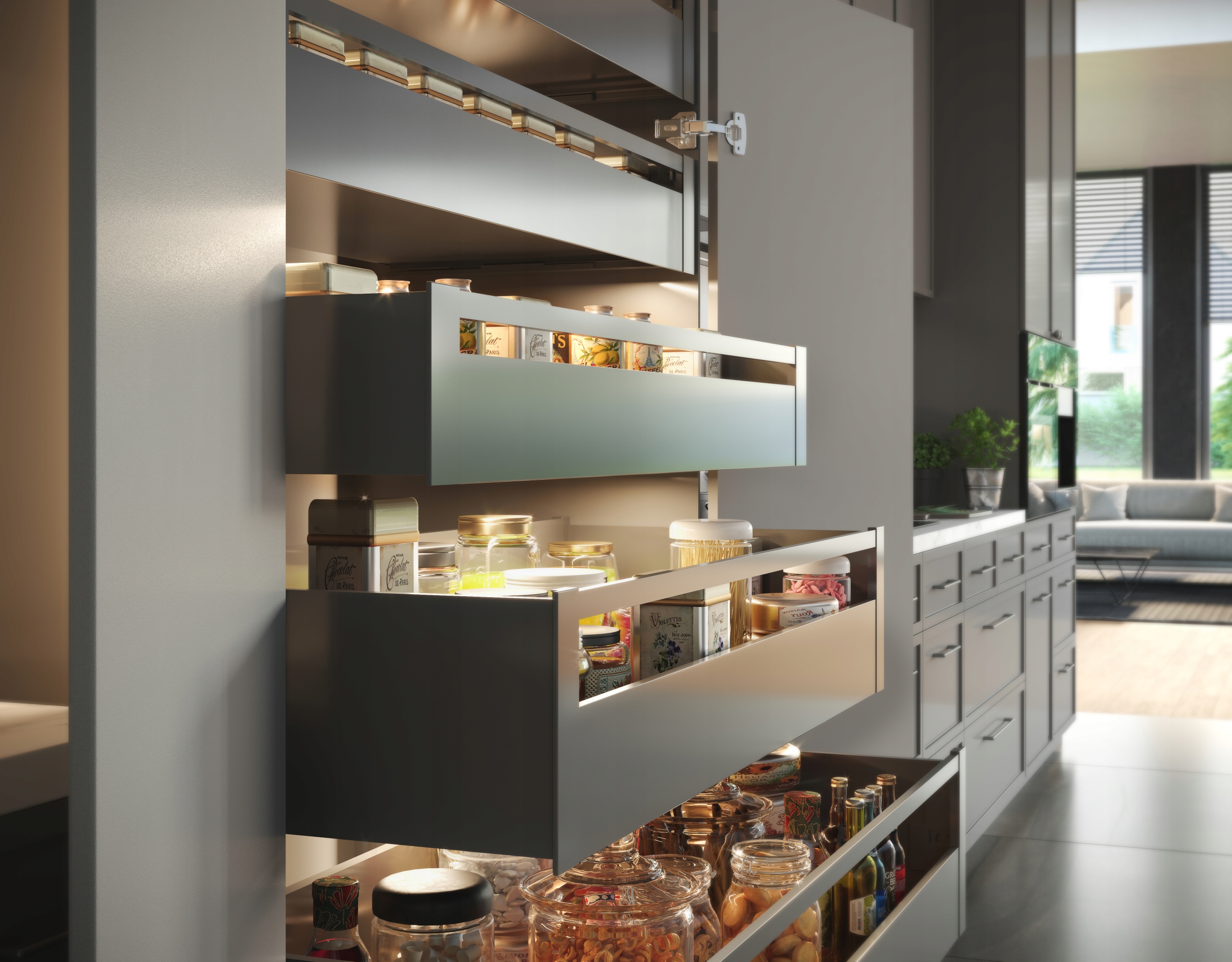 Ящики Axis Pro, крім надійності, характеризуються універсальністю використання. Їх можна використовувати як традиційні кухонні ящики або внутрішні ящики, які все частіше зустрічаються на сучасних кухнях. Щоб створити такий ящик, просто виберіть з’єднувач і передню панель відповідно до висоти сторін. Це ідеальний варіант, коли ви також хочете використовувати максимальний доступний простір.