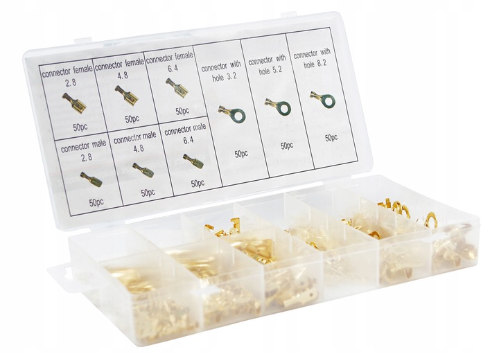Набір упакований в пластикову коробку, відсортовану за розміром, прозору - щоб можна було легко перевірити кількість роз'ємів. p>