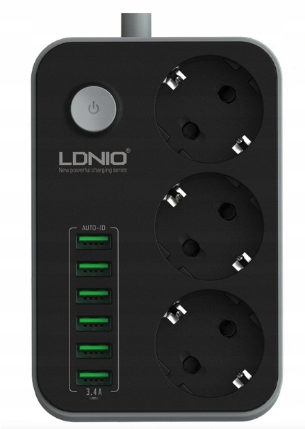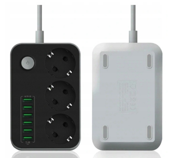 Надійний подовжувач, завдяки якому ми можемо підключати 9 пристроїв одночасно. Ми під’єднуємо три пристрої за допомогою стандартних штекерів, додаткові шість – до USB-портів, які автоматично регулюють силу струму підключеного пристрою, максимум до 3,4 А.