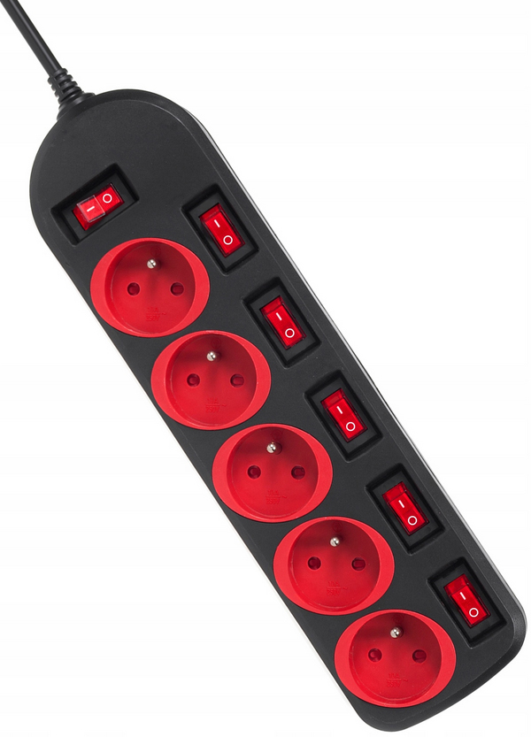 Подовжувач живлення з5 розетками дозволяє підключати до п'яти повнорозмірних вилок одночасно. Він має захист від дітей, вимикач з підсвічуванням і окремі вимикачі для кожної розетки.