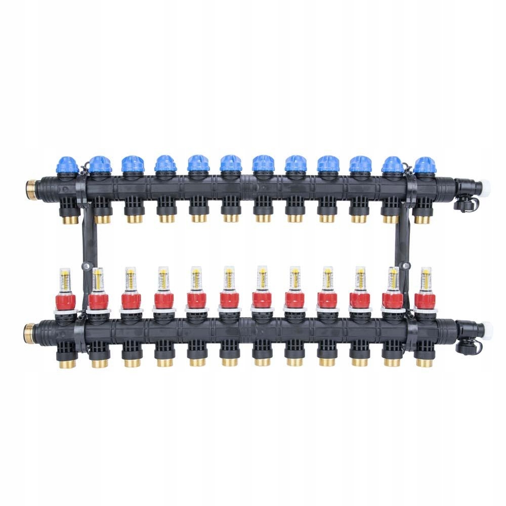 Розподільник виготовлений з міцного поліаміду PA66, стійкого до високих температур і тиску, оснащений ротаметрами з діапазоном регулювання потоку 0,2-1,6 л/хв, що дозволяє точно регулювати потік середовища в кожному контурі, обладнаному клапанами для наповнення, зливу та Термоелектричні приводи (наприклад, TSA-01) можуть бути встановлені на зворотних клапанах і підключені до зонної системи управління (наприклад, FloorControl, CosiTherm), що дозволяє самостійно регулювати температуру в кожній зоні будівлі. нагрівальні петлі.