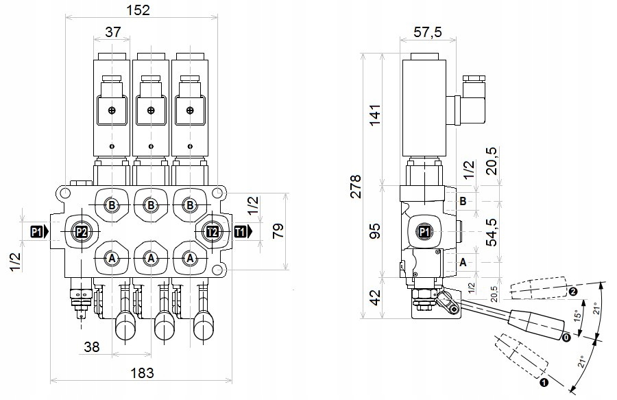 - Живлення від насоса (P1,P2): внутрішня різьба BSP 1/2''