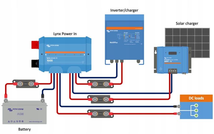 Розподільник Lynx — це модульна збірна шина, яка забезпечує вихід напруги постійного струму на інвертори або інші приймачі. Кожен пристрій дозволяє підключати 4 позитивних і негативних шляхи напруги постійного струму. Також можна використовувати запобіжник MegaFuse на позитивному полюсі кожного виходу. Розподільник Lynx підключається до розподільника Power In, який забезпечує вхід напруги для акумуляторів на шину постійного струму.
