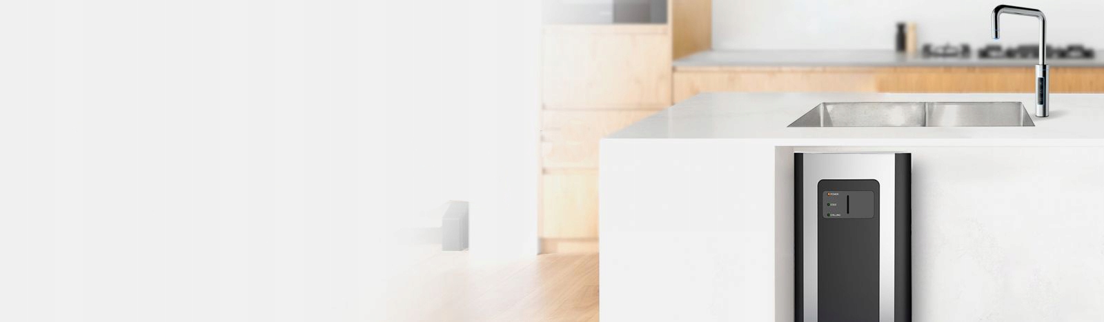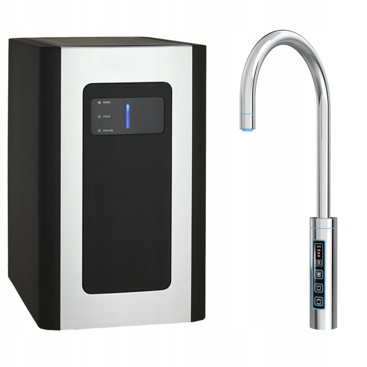 Змішувач має синє світлодіодне підсвічування та три кнопки управління - холодною, газованою та гарячою водою.