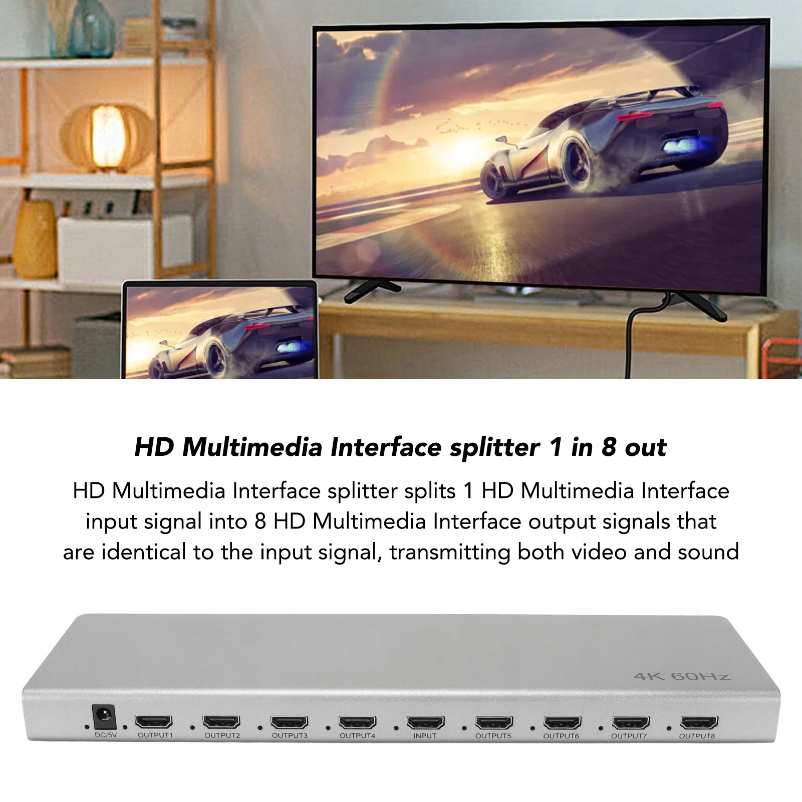 4. 1 вхід, 8 виходів: мультимедійний інтерфейс HD розділяє 1 вхідний сигнал мультимедійного інтерфейсу HD на 8 сигналів мультимедійного інтерфейсу HD, які ідентичні вхідному сигналу, передають відео та аудіо одночасно