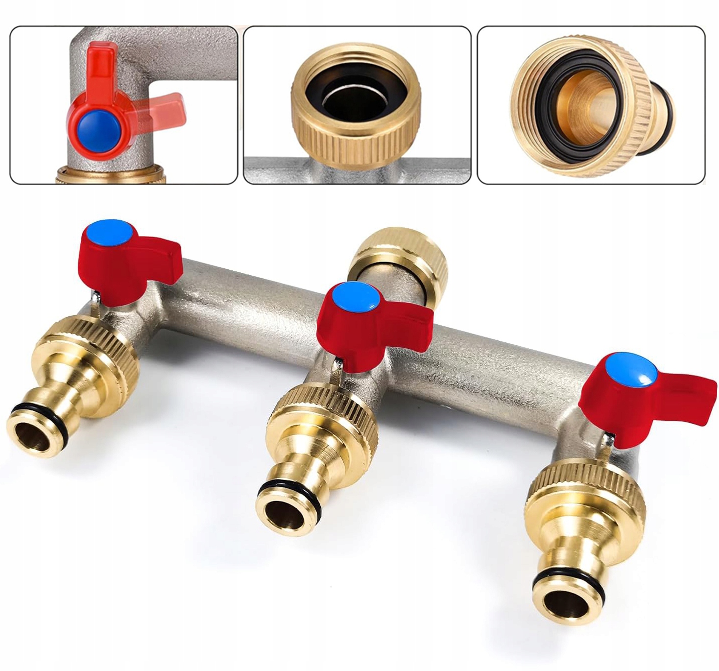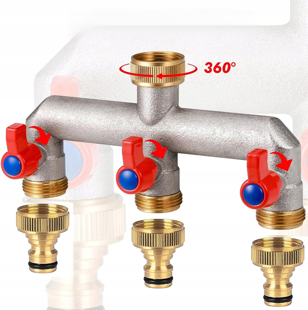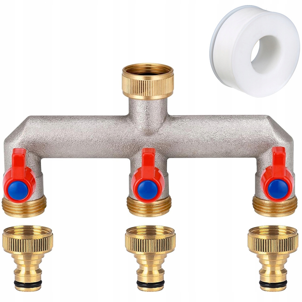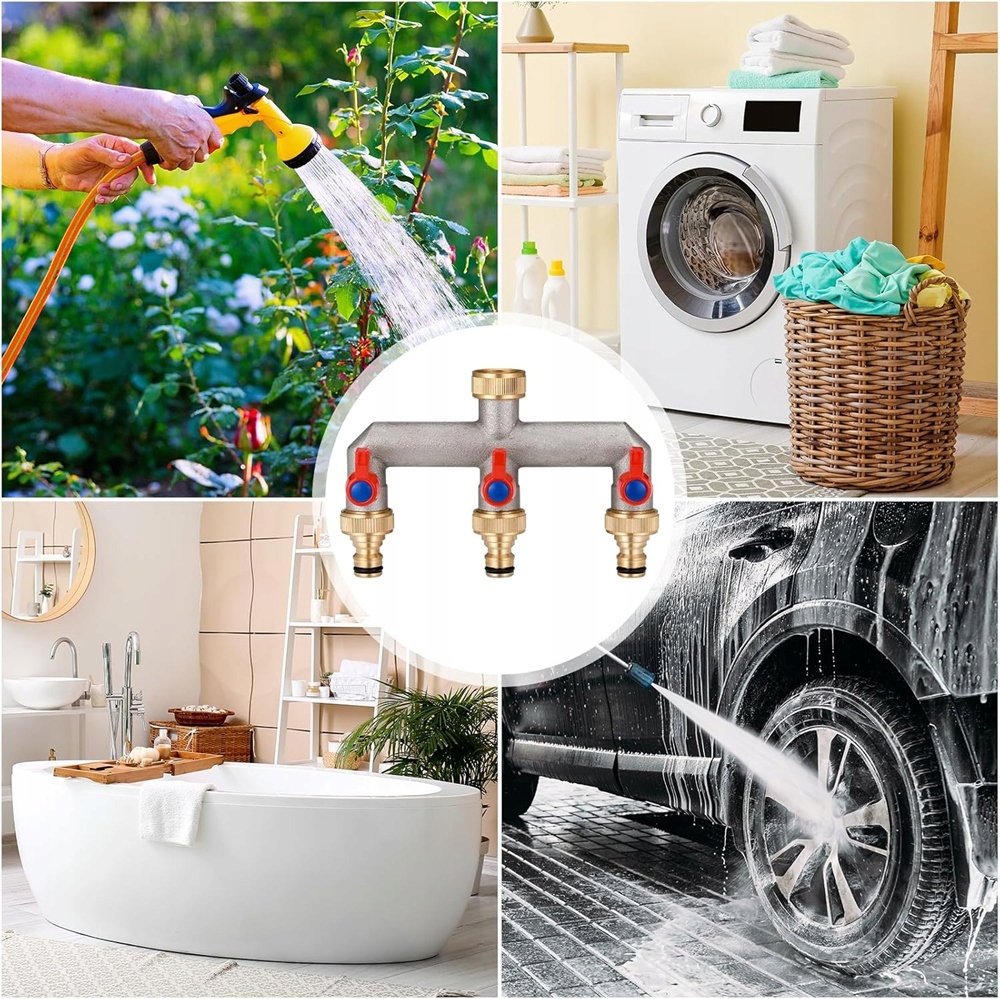 - 3-х напрямний розповсюджувач води підходить для популярних G 3/4 кранів з 3/4 "внутрішньої нитки (Ø24,5 мм), що використовується для відкладення потоку води до 2-х напрямків із зовнішньою темою 3/4" (Ø26 мм). Є 3 латунні адаптери.