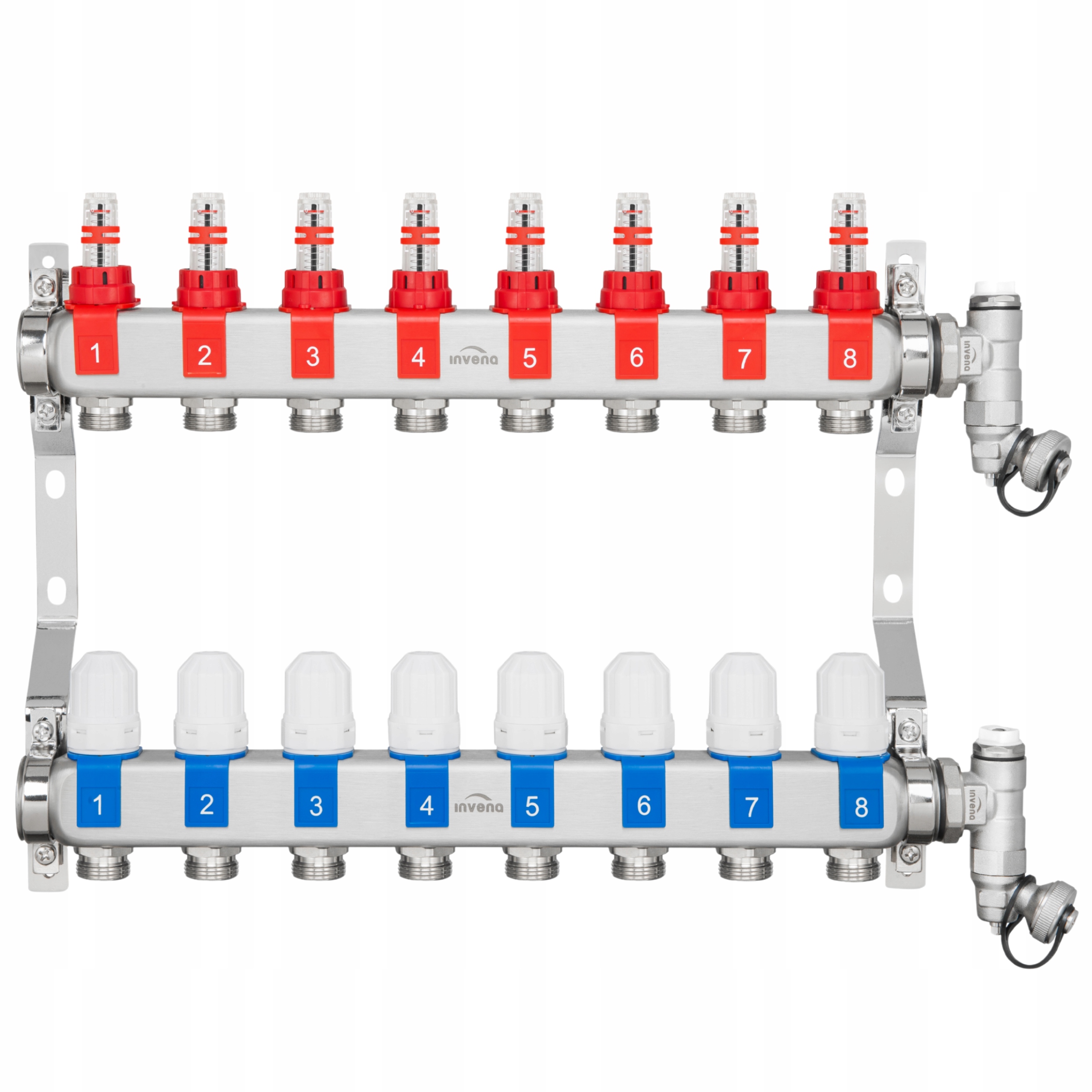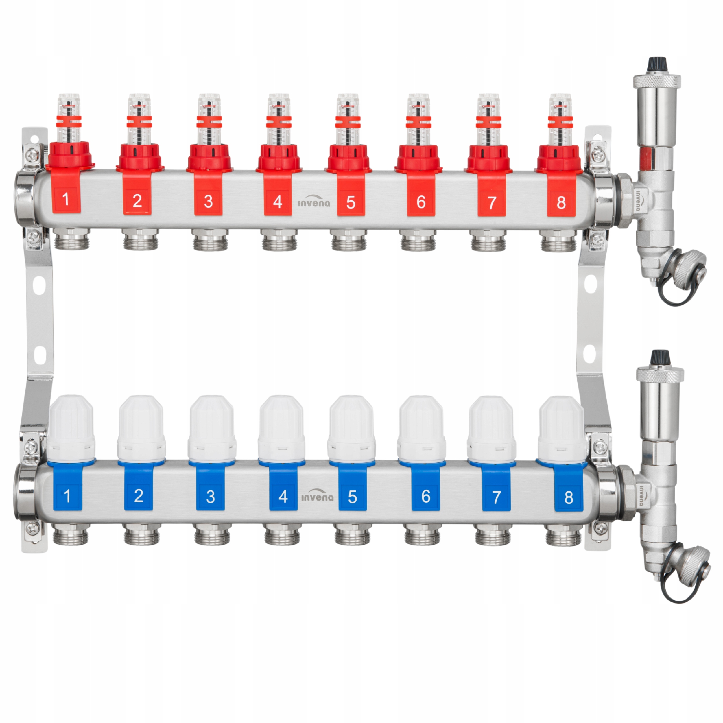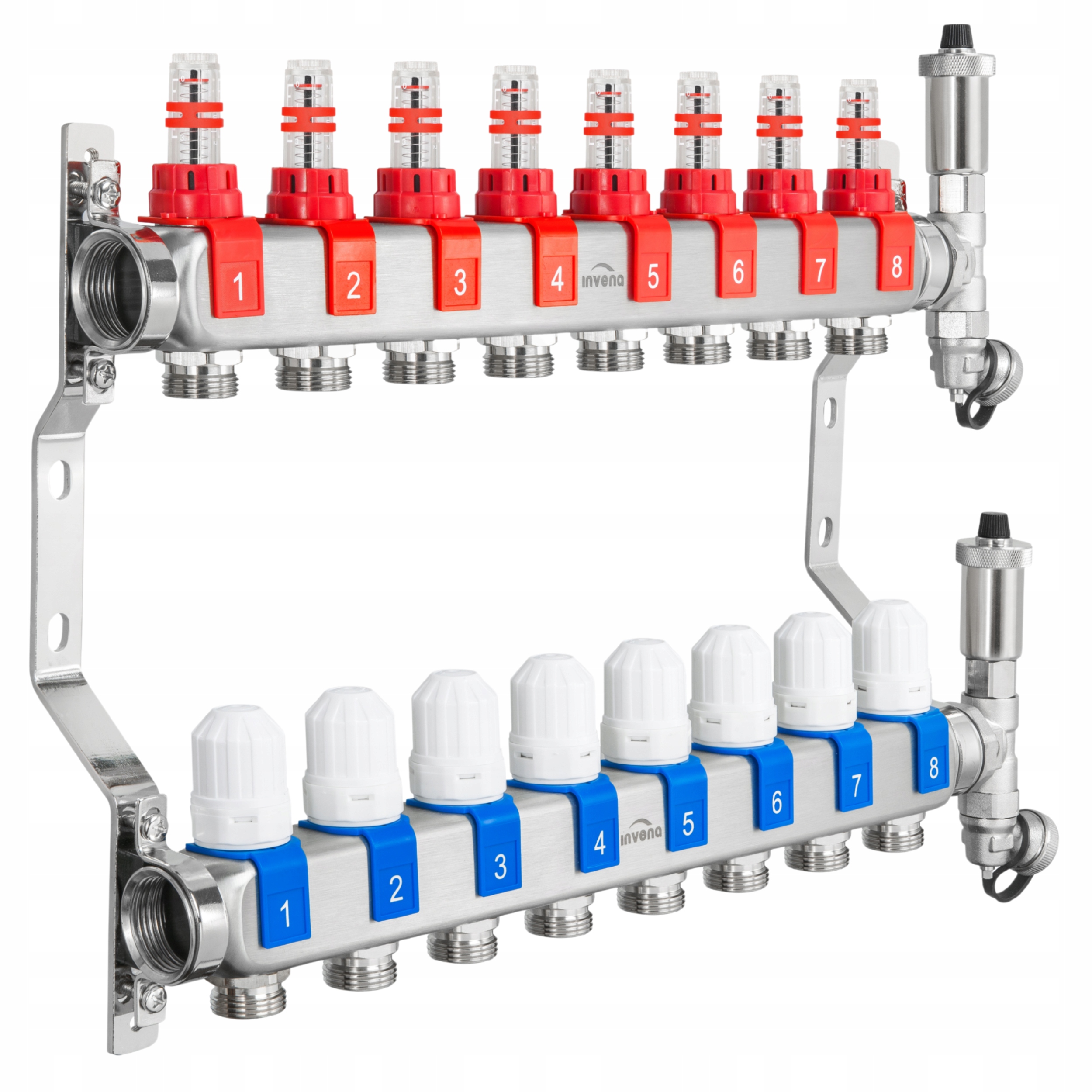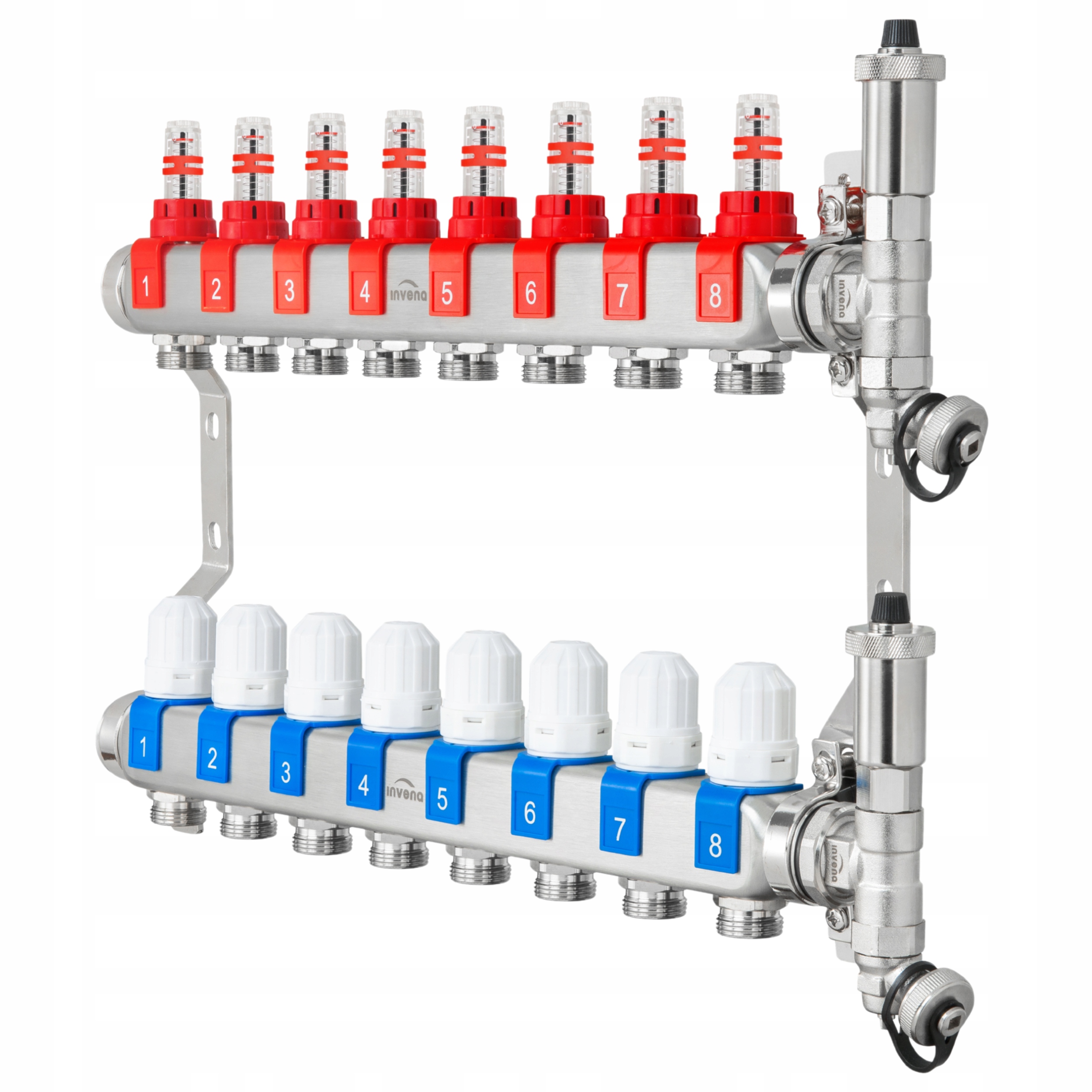 ⏩ інвена PM-06-008-Z Дистриб'ютор з нержавіючої сталі (8 ланцюгів)-промені нерухомості сталі SS304 (1.4301), ротаметри, термостатичні вставки для циліндрів, автоматичний та ручний вентиляційний набір.