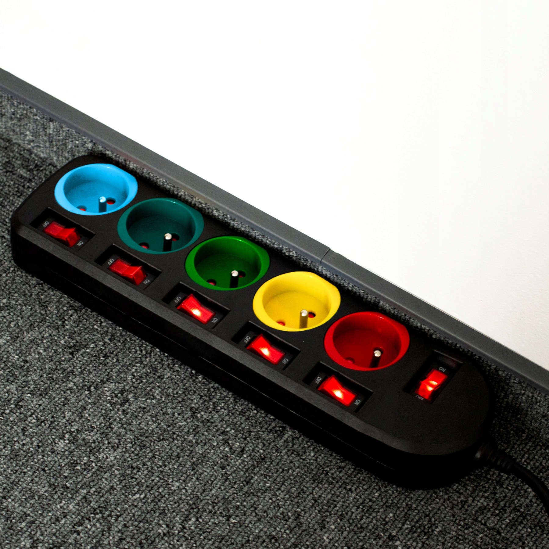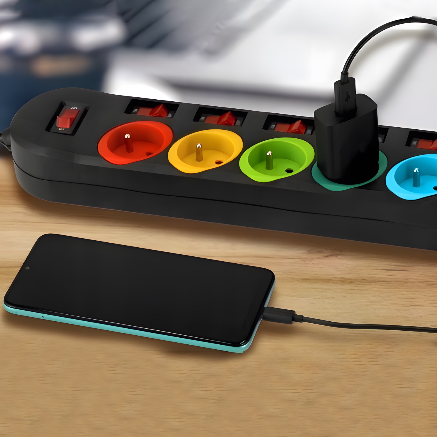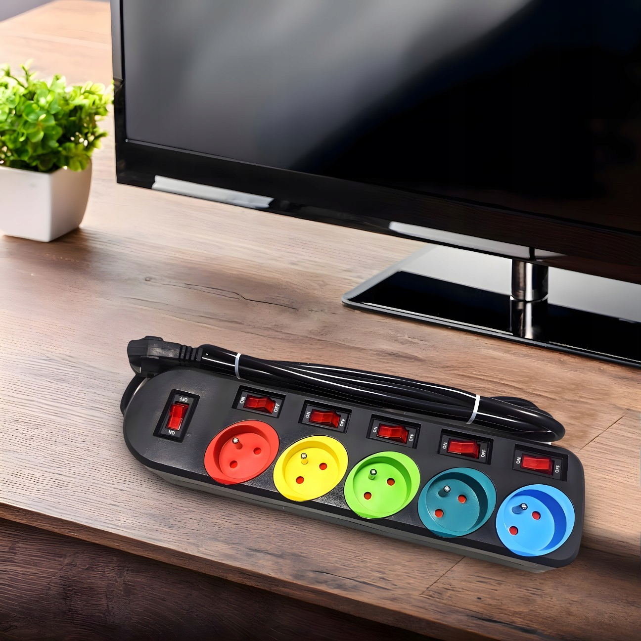 Розширений шнур з 5 барвистими розетками дозволяє підключати пристрої, віддалені від електричної розетки, пропонуючи максимальну потужність 2500 Вт.