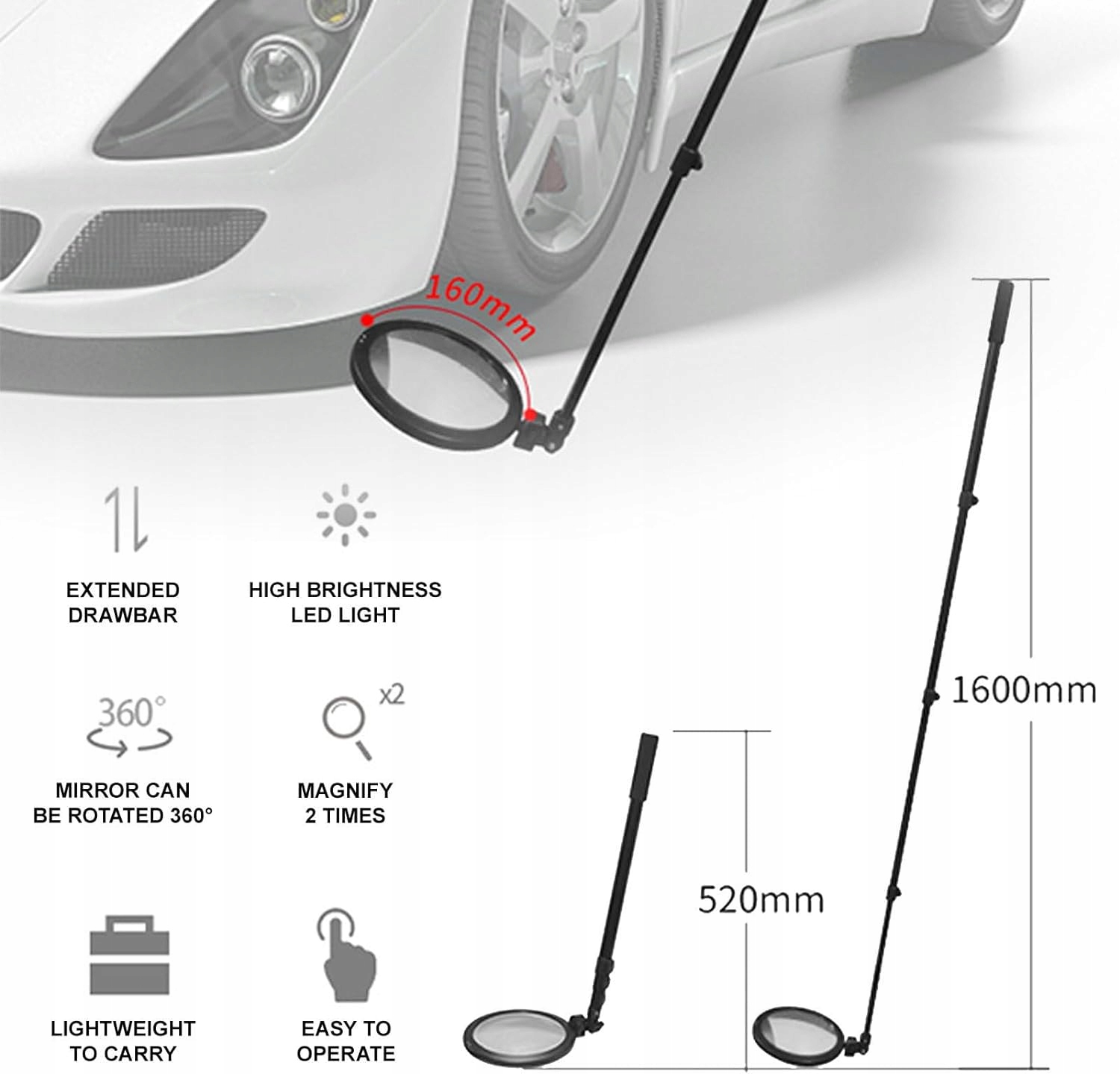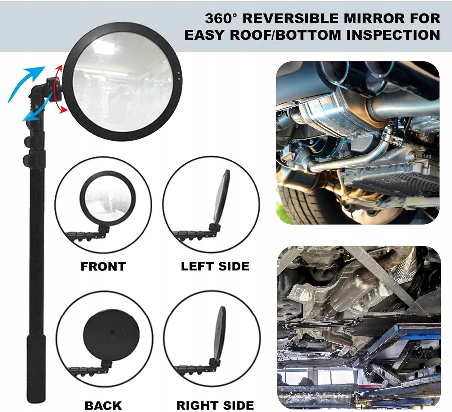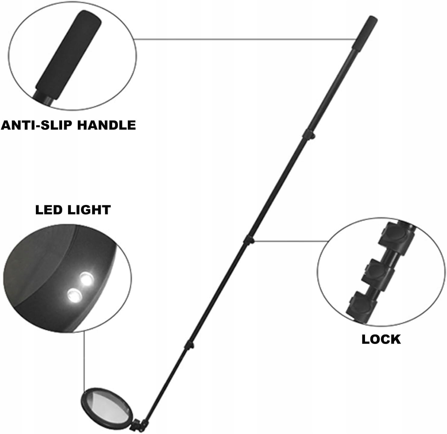 Економте час, телескопічна система оглядового дзеркала ідеально підходить для пошуку під капотом автомобіля або для пошуку предметів у тісному та тісному просторі без необхідності нахилятися або втрачати увагу на завданні огляду. Оглядові дзеркала є чудовим інструментом для огляду днища автомобілів, машин, вантажівок, шкільних автобусів, поїздів, будівельної техніки, промислових підприємств та інших важкодоступних місць. Акрилові матеріали для дзеркал. Високоміцне бійне акрилове дзеркало має вдвічі менше ваги, ніж звичайні скляні дзеркала такого ж розміру, має певну міцність, його нелегко зламати, і має таку ж яскравість, як скляні дзеркала. Повністю закрите квадратне дзеркало з пофарбованою залізною основою може ефективно запобігти пошкодженню дзеркала через зіткнення. Регульована вудка жердина регулюється від 52 см до 160 см. Він може проникати глибоко в транспортні засоби та об'єкти, які потрібно виявити. Поверхня оброблена зовнішньою фарбою, випеченою в майстерні без пилу, і не зникає навіть після тривалого використання. Оснащений чорною бавовняною ручкою, він зручно лежить у руці та підходить для тривалого використання. Світлодіодні ліхтарі та акумуляторна конструкція з інспекційним дзеркалом зі світлодіодними ліхтарями ви можете перевірити місце розташування дефектів автомобіля під різними кутами, не впливаючи на пряму видимість. Завдяки вбудованій батареї ви не обмежені кабелями під час перевірки. Наші вироби легко переносити, їх можна скласти та закріпити, щоб їх могла винести одна людина. Він може бути оснащений зручною сумкою для перенесення, яку можна розібрати та зберігати, коли нею не користуєтесь.