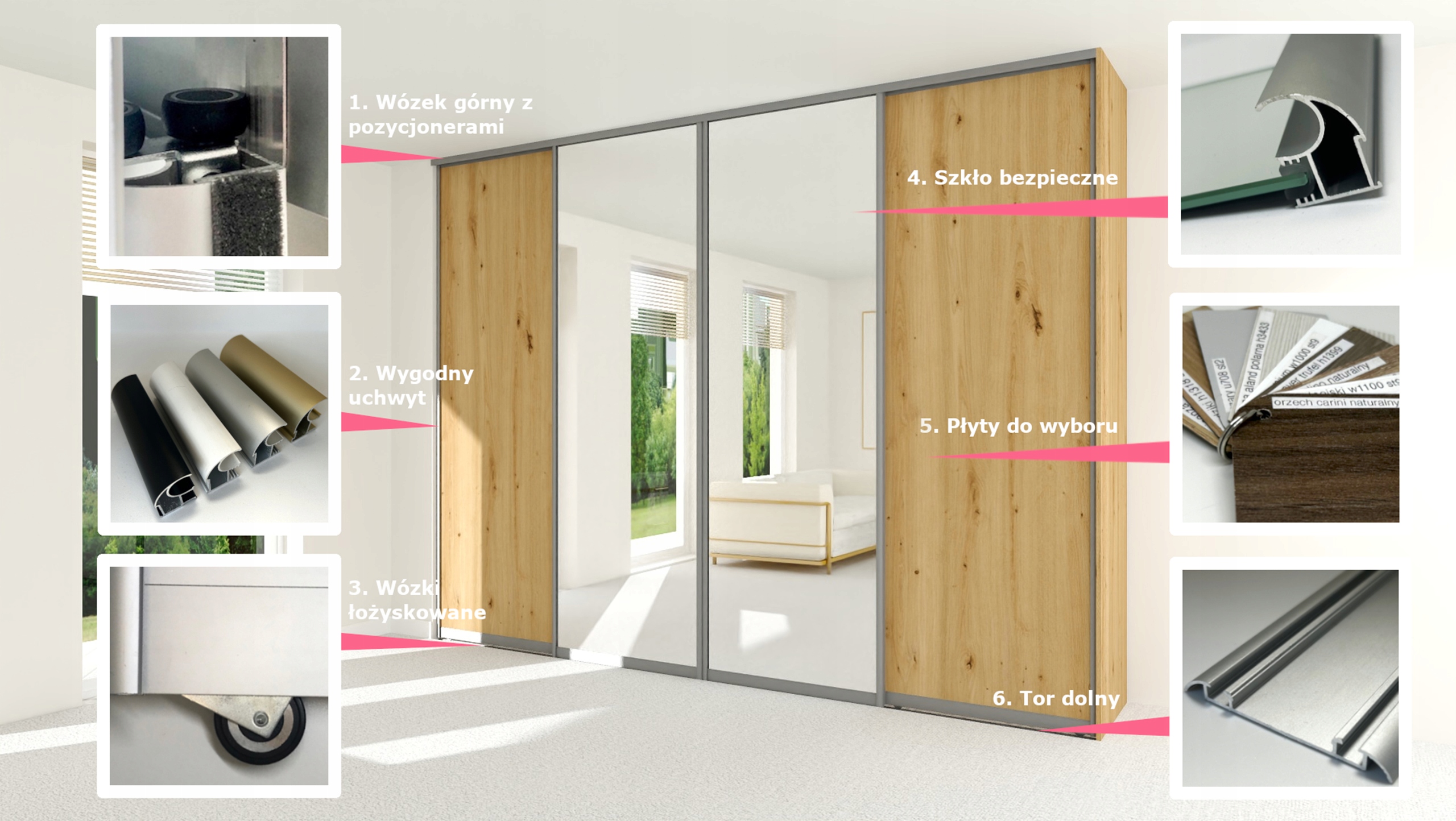 - Нижнітефлонові каретки з довічною гарантією, завдяки чому двері ходять плавно та тихо.
