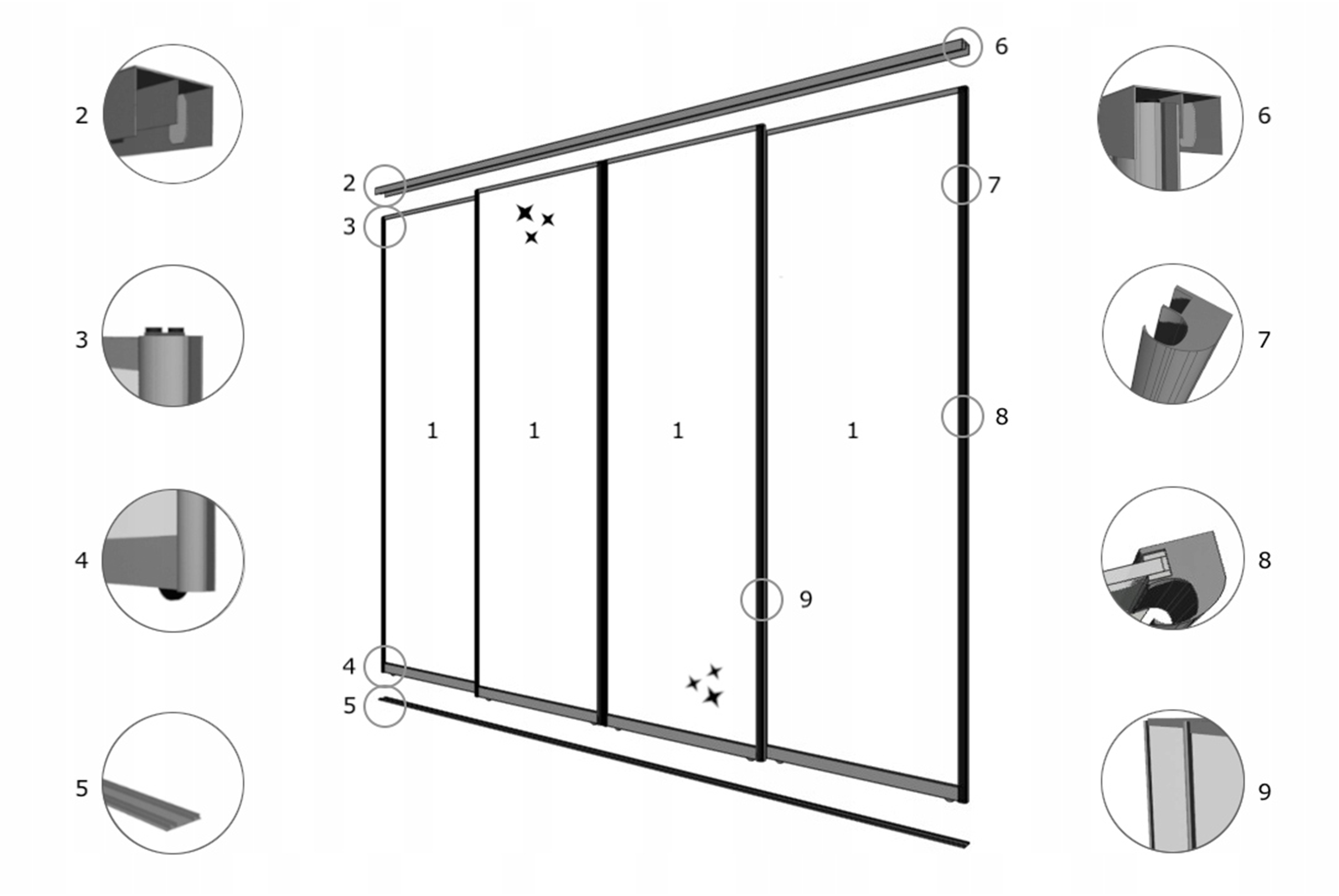 Дверцята надходять повністю закрученими, готовими до вставлення між вирізаними за розміром рейками.