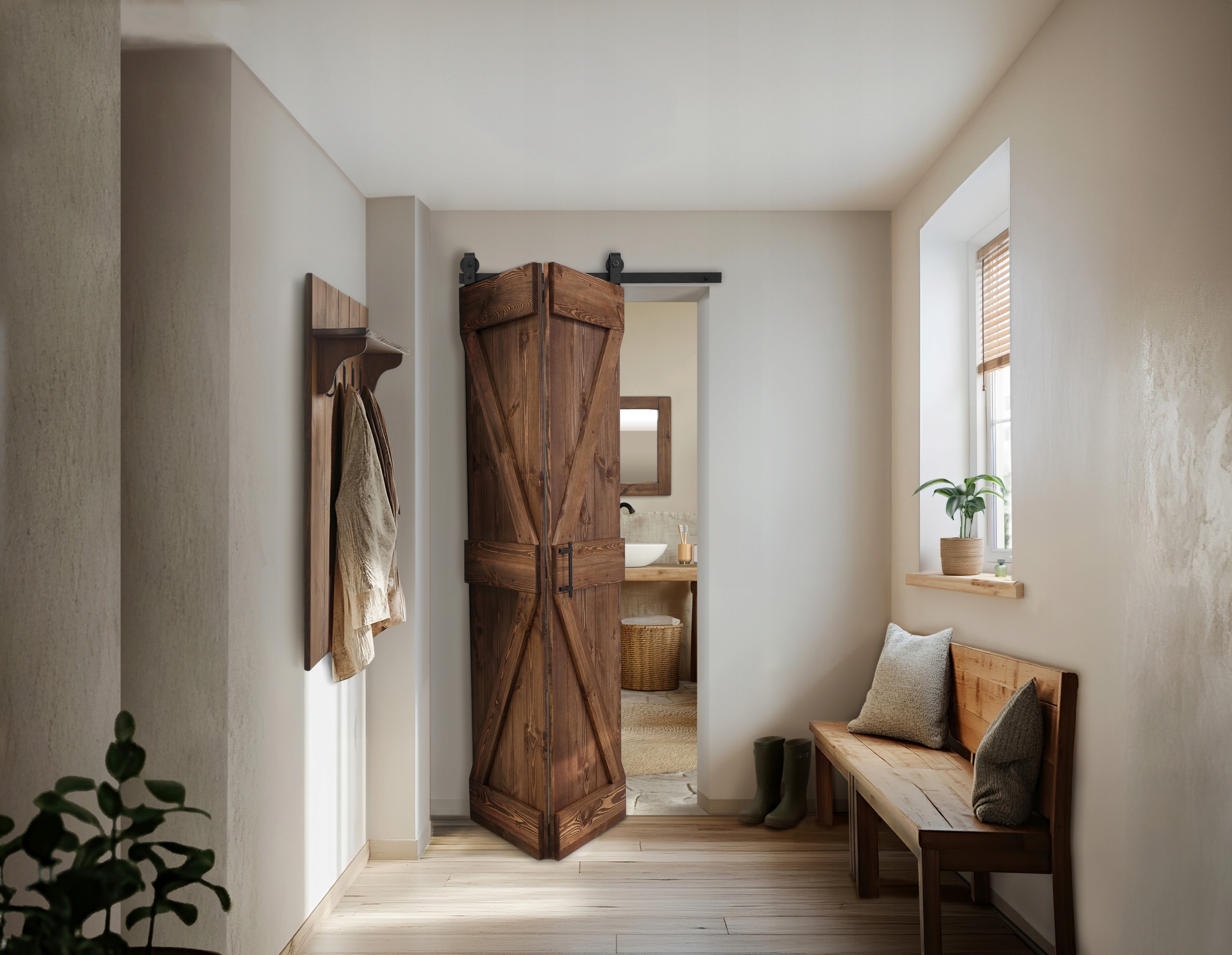 Складчасті двері Forest — чудовий вибір для вузькі коридори або невеликі приміщення, де важливий кожен сантиметр. Виготовлені з натуральної сировини, вони мають красиві зернисті малюнки, сучки та тріщини, які так характерні для деревини. Декоративні стрілчасті вставки надають їм сільського характеру в стилі дверей сараю, який ідеально вписується в інтер'єр сільського стилю, фермерського будинку та мансарди. Міцна конструкція та точне виконання гарантують довговічність та стабільність, що робить ці двері ідеальним рішенням для будь-якого інтер’єру.