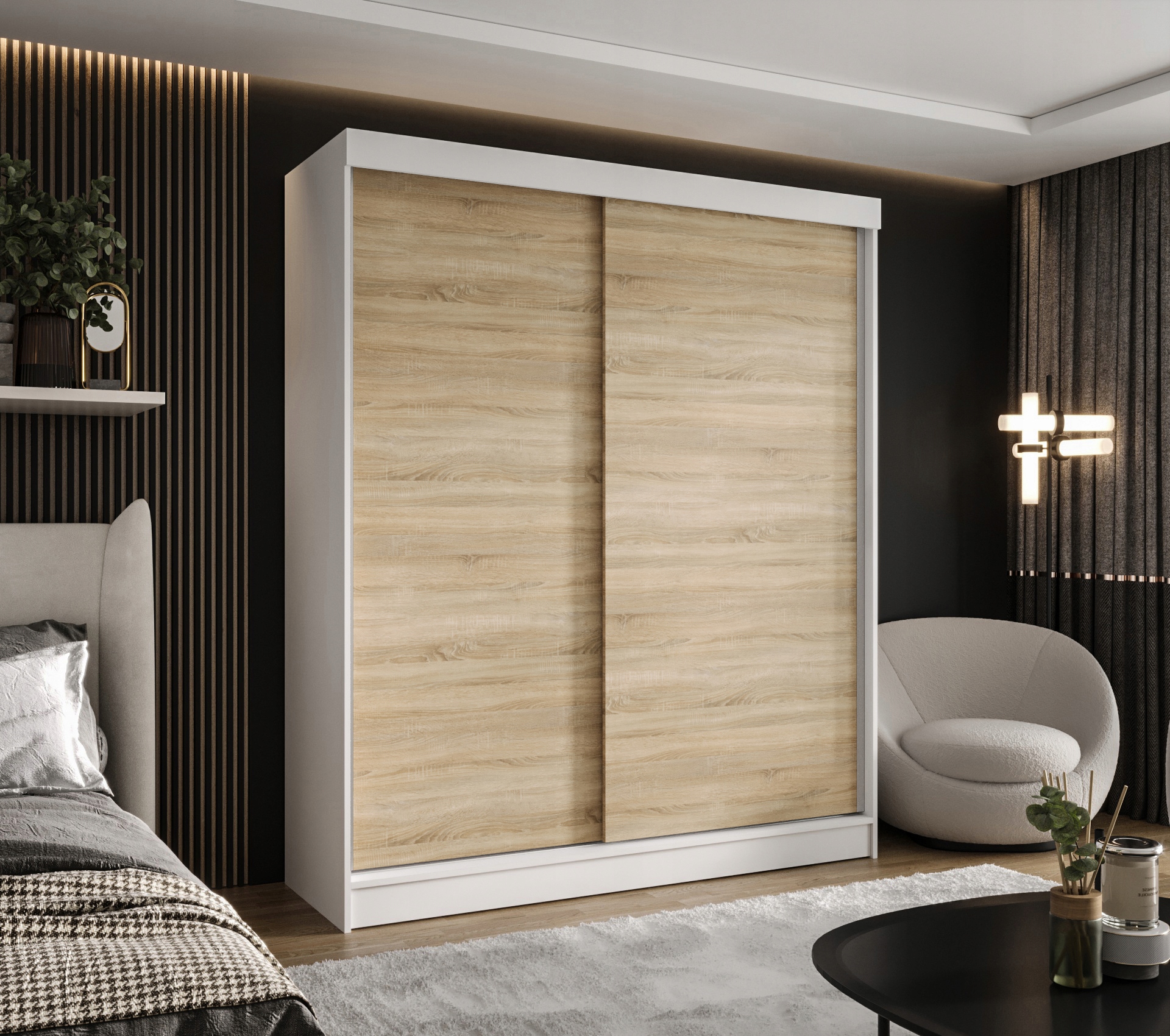 Ви шукаєте стильне та функціональне рішення для вашого інтер’єру? Розсувний гардероб з тілом у кольорі вотанського дуба та білих фронтів є ідеальним поєднанням елегантності та природного тепла. Контраст деревини з глибоким чорним підкреслює сучасний характер розташування, додавання виразності та класу до інтер’єру.