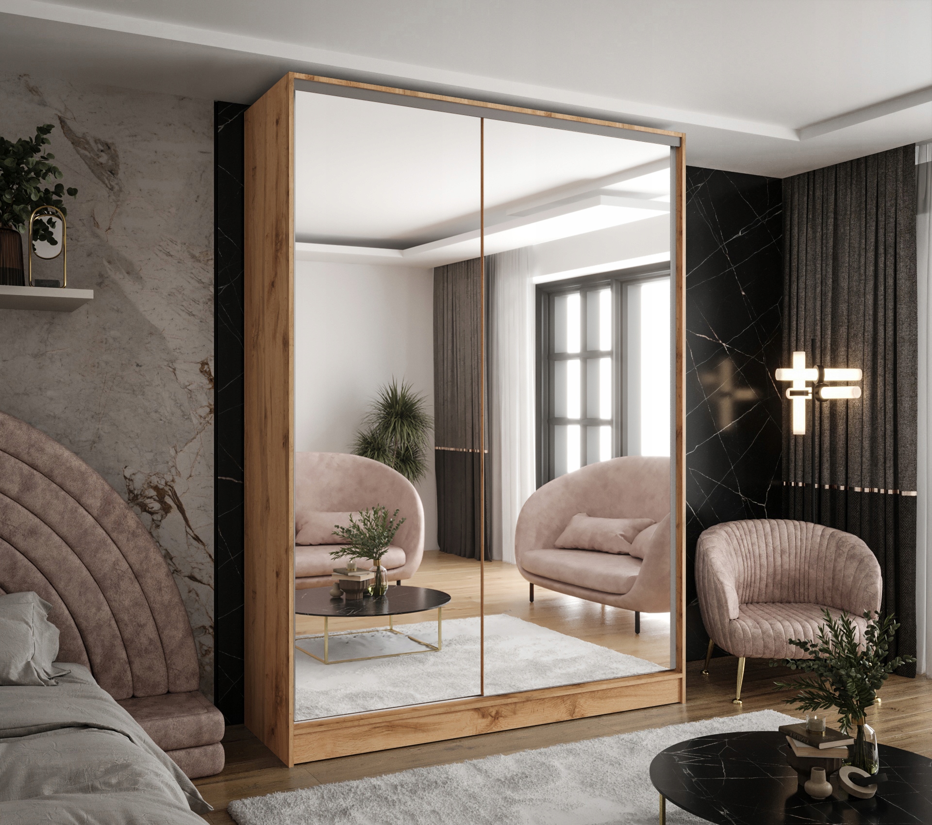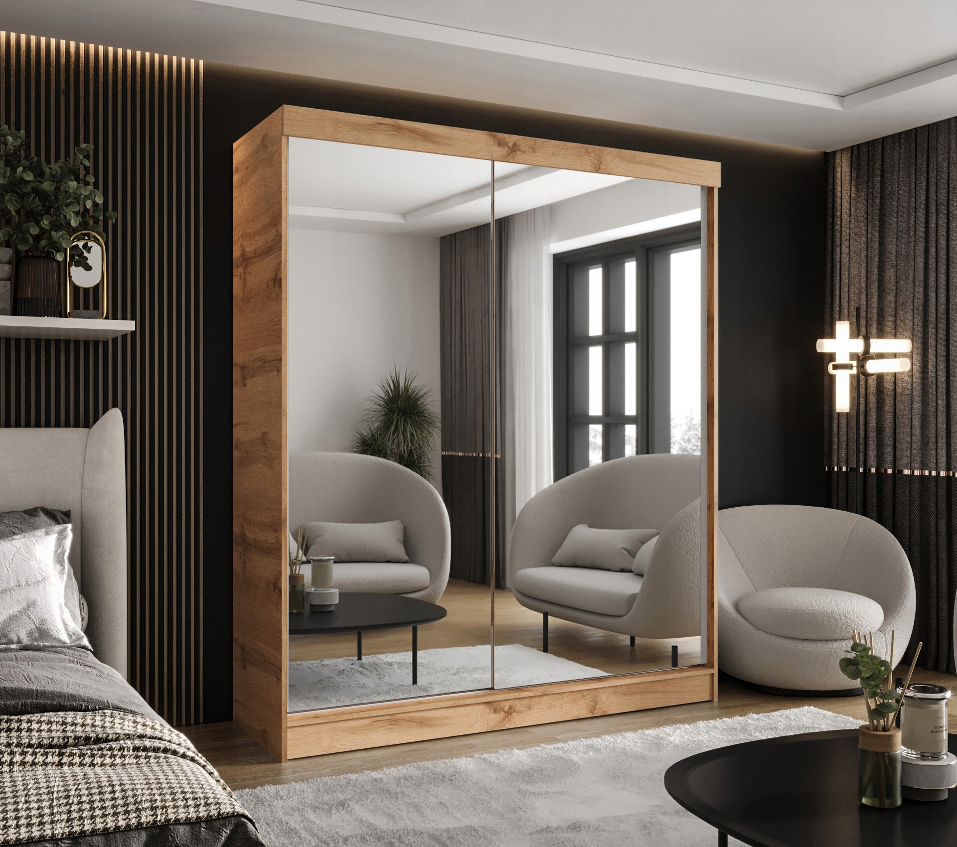 Ви хочете надати своєму інтер'єру сучасний та виразний інтер'єр?Розсувний гардероб у декорі Сонома з двома дзеркалами на фронтах - це елегантне і функціональне рішення, яке ідеально вписується в теплі природні салони. Світловий відтінок деревини вводить затишну атмосферу, а дзеркала на фронтах оптично збільшують простір і додають легкість інтер’єру. Це універсальний предмет меблів, який буде чудовим у спальні, гардеробі та передпокої, поєднуючи естетику деревини з практичністю повсякденного використання.