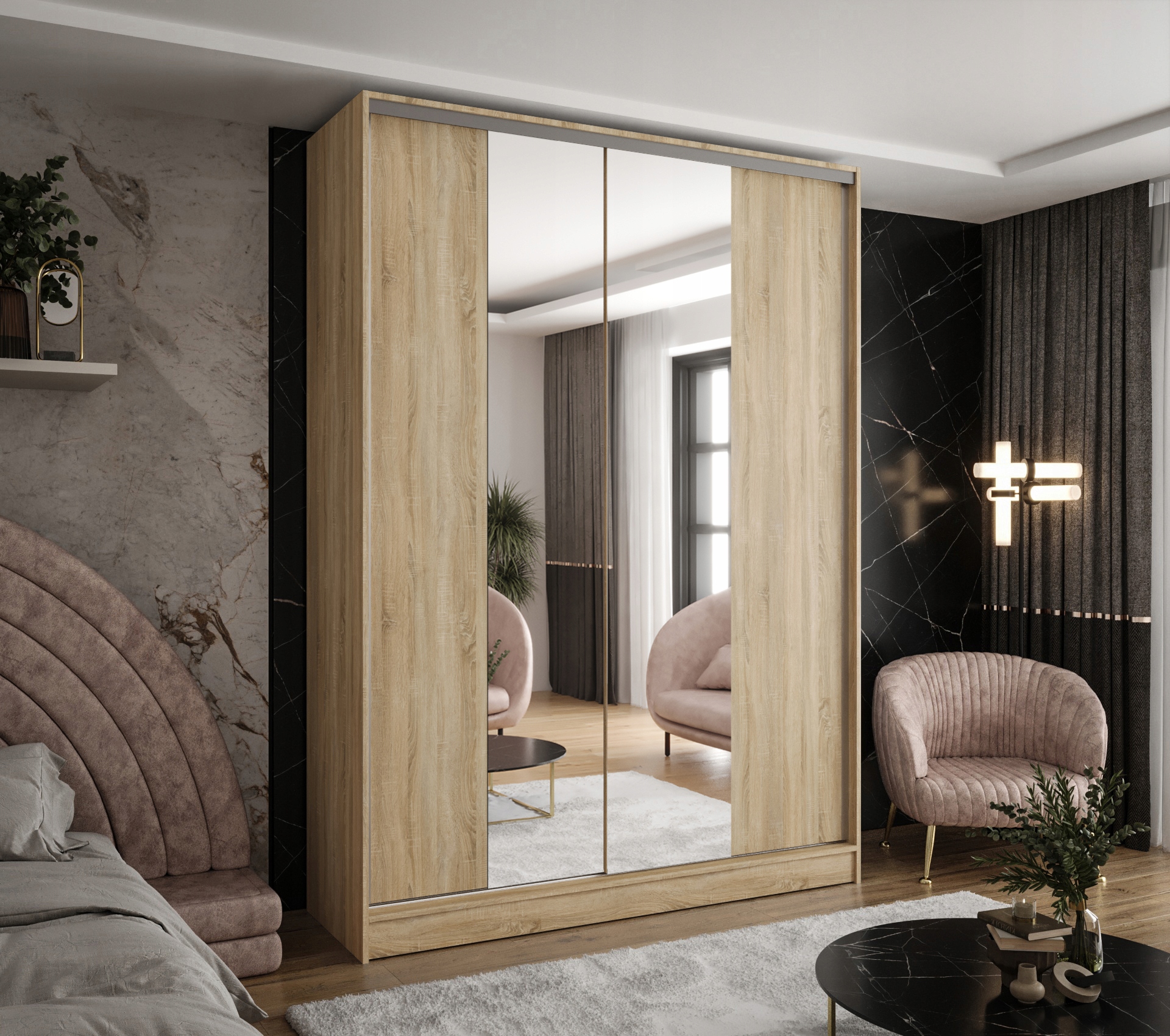 ✨ Двохверний розсувний гардероб- Сонома + Чорний дуб з половиною дзеркала ✨
