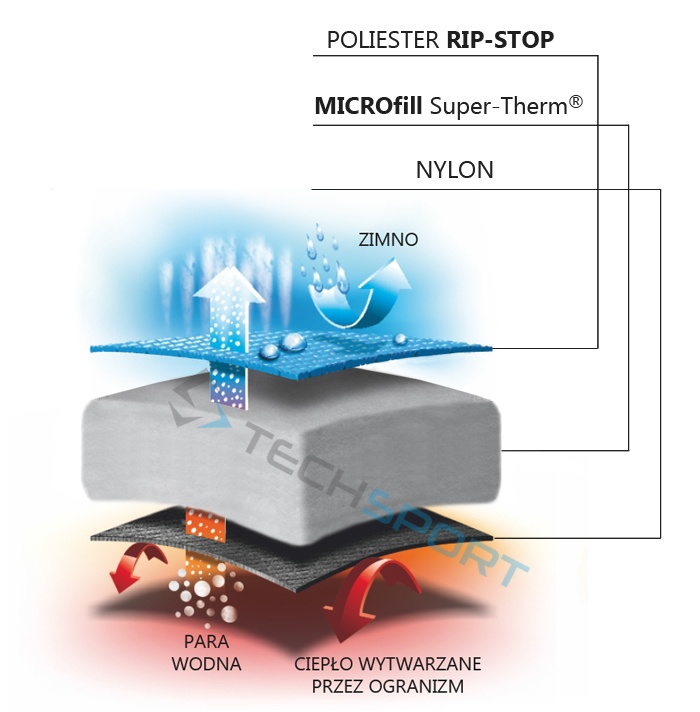 - середній шар - MICROfill Super-Therm® - дуже теплий, легкий і м'який утеплювач із спірально скручених силіконізованих поліефірних волокон; не викликає алергії, без органічних добавок, не вбирає водяну пару.