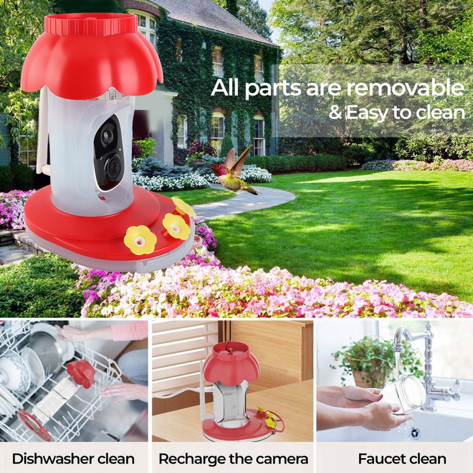 2. НАЛАШТУВАННЯ ПІД ЗАМОВЛЕННЯ: бездротова зовнішня годівниця для птахів із камерою оснащена різними пристроями для годування, які відповідають харчовим звичкам різних видів птахів, що дозволяє налаштувати годівницю. Такі функції, як баночка з медом для колібрі та піднос із фруктами для всіх птахів.